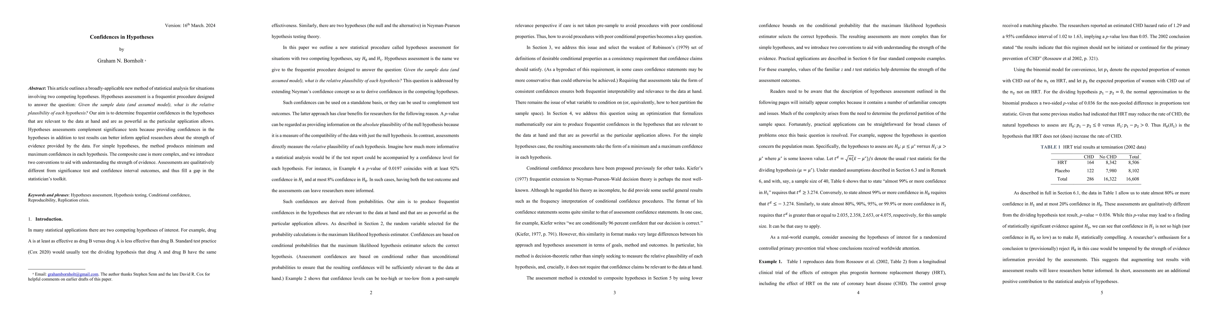 This article outlines a broadly-applicable new method of statistical analysis for situations involving two competing hypotheses. Hypotheses assessment is a frequentist procedure designed to answer the question: Given the sample evidence (and assumed model), what is the relative plausibility of each hypothesis? Our aim is to determine frequentist confidences in the hypotheses that are relevant to the data at hand and are as powerful as the particular application allows. Hypotheses assessments complement significance tests because providing confidences in the hypotheses in addition to test results can better inform applied researchers about the strength of evidence provided by the data. For simple hypotheses, the method produces minimum and maximum confidences in each hypothesis. The composite case is more complex, and we introduce two conventions to aid with understanding the strength of evidence. Assessments are qualitatively different from significance test and confidence interval outcomes, and thus fill a gap in the statistician's toolkit.