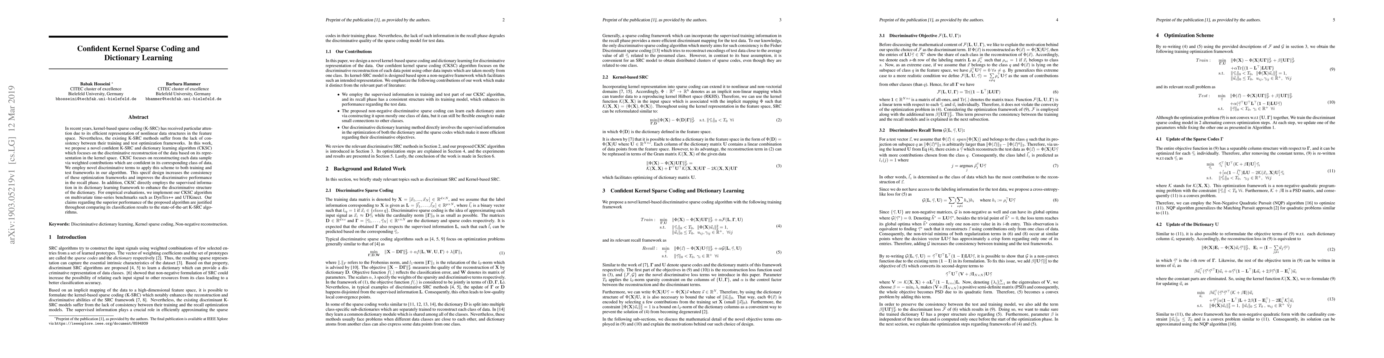 In recent years, kernel-based sparse coding (K-SRC) has received particular attention due to its efficient representation of nonlinear data structures in the feature space. Nevertheless, the existing K-SRC methods suffer from the lack of consistency between their training and test optimization frameworks. In this work, we propose a novel confident K-SRC and dictionary learning algorithm (CKSC) which focuses on the discriminative reconstruction of the data based on its representation in the kernel space. CKSC focuses on reconstructing each data sample via weighted contributions which are confident in its corresponding class of data. We employ novel discriminative terms to apply this scheme to both training and test frameworks in our algorithm. This specific design increases the consistency of these optimization frameworks and improves the discriminative performance in the recall phase. In addition, CKSC directly employs the supervised information in its dictionary learning framework to enhance the discriminative structure of the dictionary. For empirical evaluations, we implement our CKSC algorithm on multivariate time-series benchmarks such as DynTex++ and UTKinect. Our claims regarding the superior performance of the proposed algorithm are justified throughout comparing its classification results to the state-of-the-art K-SRC algorithms.