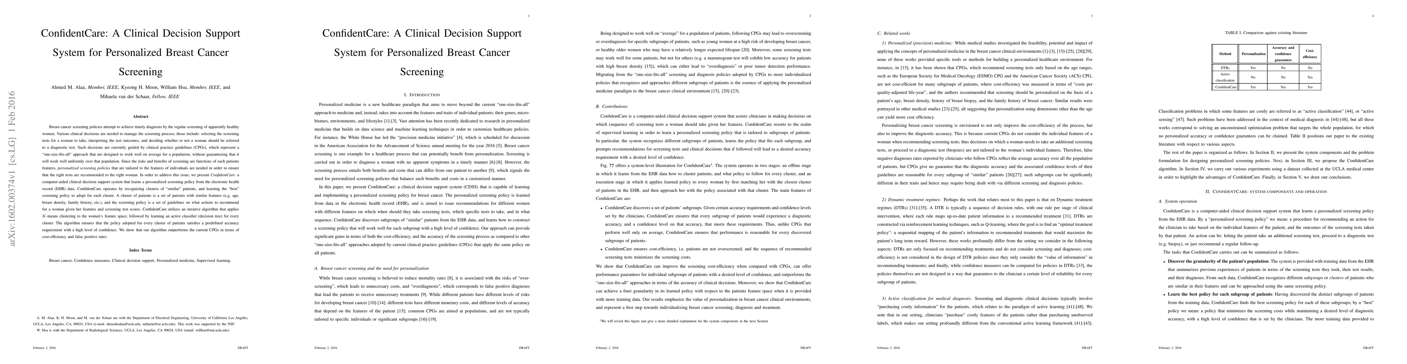 ConfidentCare is a personalized clinical decision support system for breast cancer screening that tailors screening policies based on individual patient features, outperforming traditional guidelines in cost-efficiency and reducing false positives. It learns optimal screening strategies from electronic health records by identifying clusters of patients with similar characteristics.
