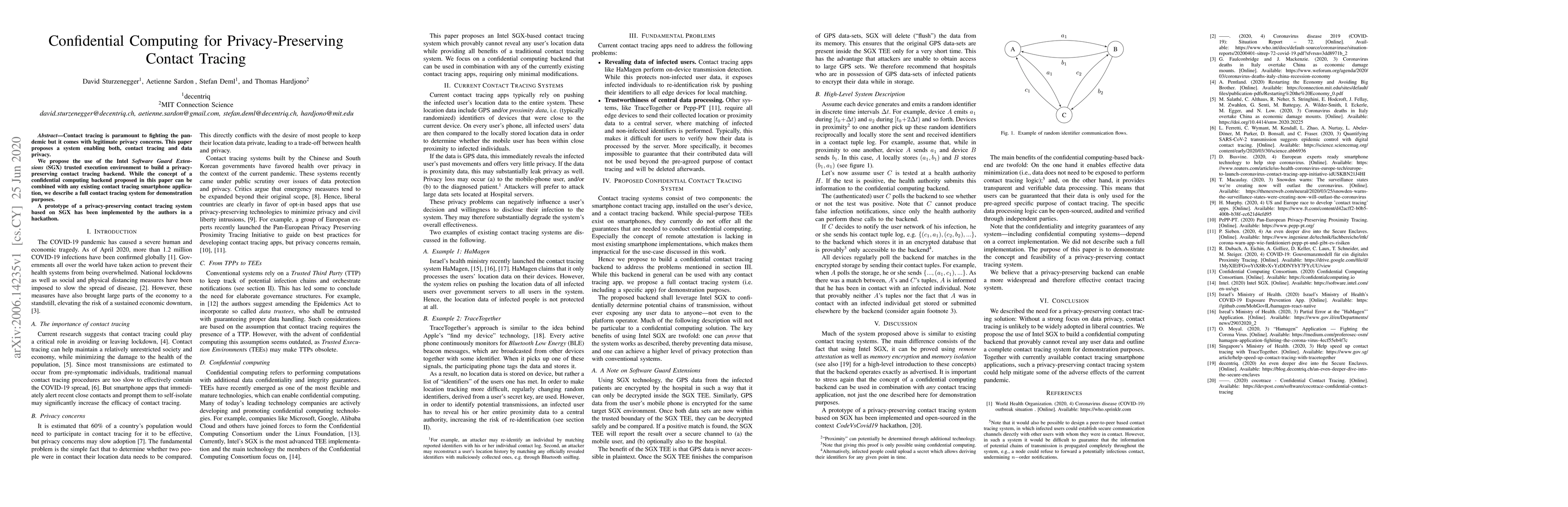 This paper proposes a confidential computing system using Intel SGX to enable privacy-preserving contact tracing, addressing privacy concerns while maintaining effective tracing capabilities. The authors implemented a prototype during a hackathon to demonstrate the feasibility of their approach.