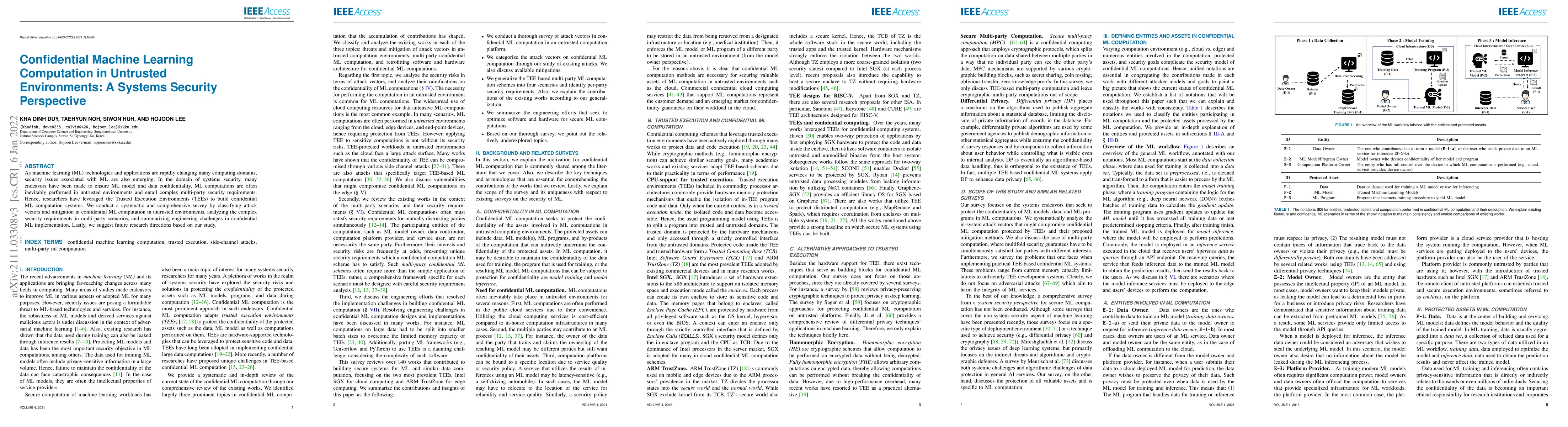 This paper surveys confidential machine learning computation in untrusted environments, focusing on systems security. It classifies attack vectors and mitigation strategies, analyzes multi-party security requirements, and highlights engineering challenges, concluding with future research directions.