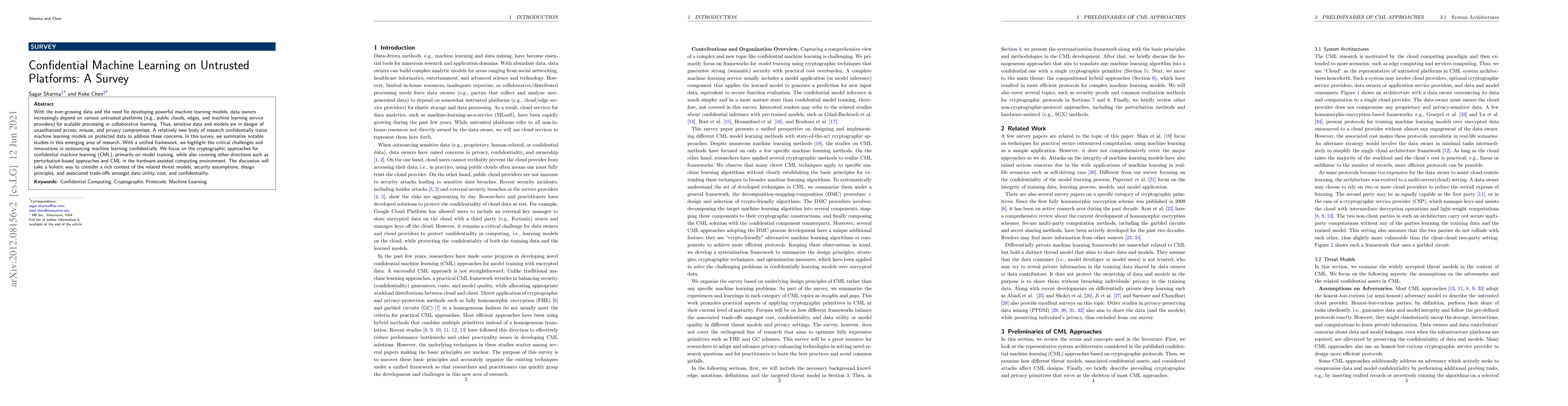 This paper surveys confidential machine learning (CML) techniques for training models on untrusted platforms, focusing on cryptographic approaches to protect sensitive data. It highlights challenges, innovations, and trade-offs, considering threat models, security assumptions, and design principles for CML.