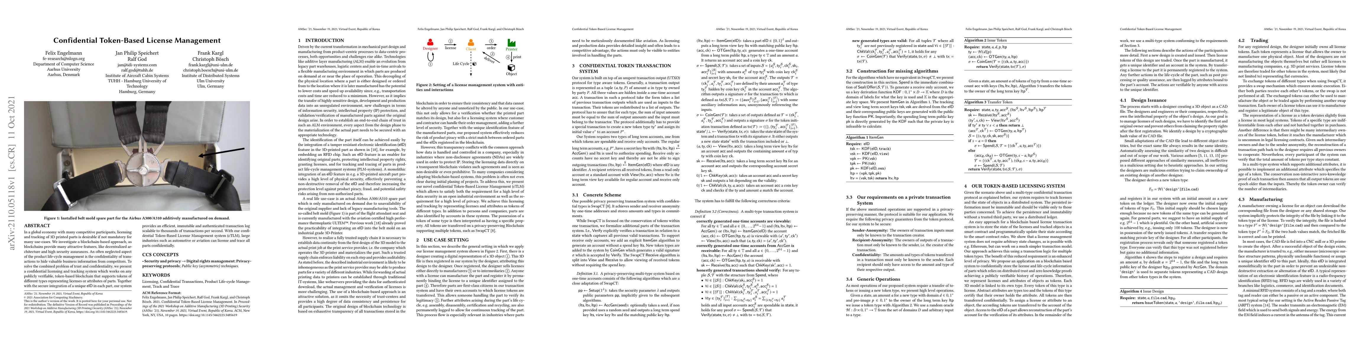 In a global economy with many competitive participants, licensing and tracking of 3D printed parts is desirable if not mandatory for many use-cases. We investigate a blockchain-based approach, as blockchains provide many attractive features, like decentralized architecture and high security assurances. An often neglected aspect of the product life-cycle management is the confidentiality of transactions to hide valuable business information from competitors. To solve the combined problem of trust and confidentiality, we present a confidential licensing and tracking system which works on any publicly verifiable, token-based blockchain that supports tokens of different types representing licenses or attributes of parts. Together with the secure integration of a unique eID in each part, our system provides an efficient, immutable and authenticated transaction log scalable to thousands of transactions per second. With our confidential Token-Based License Management system (cTLM), large industries such as automotive or aviation can license and trace all parts confidentially.