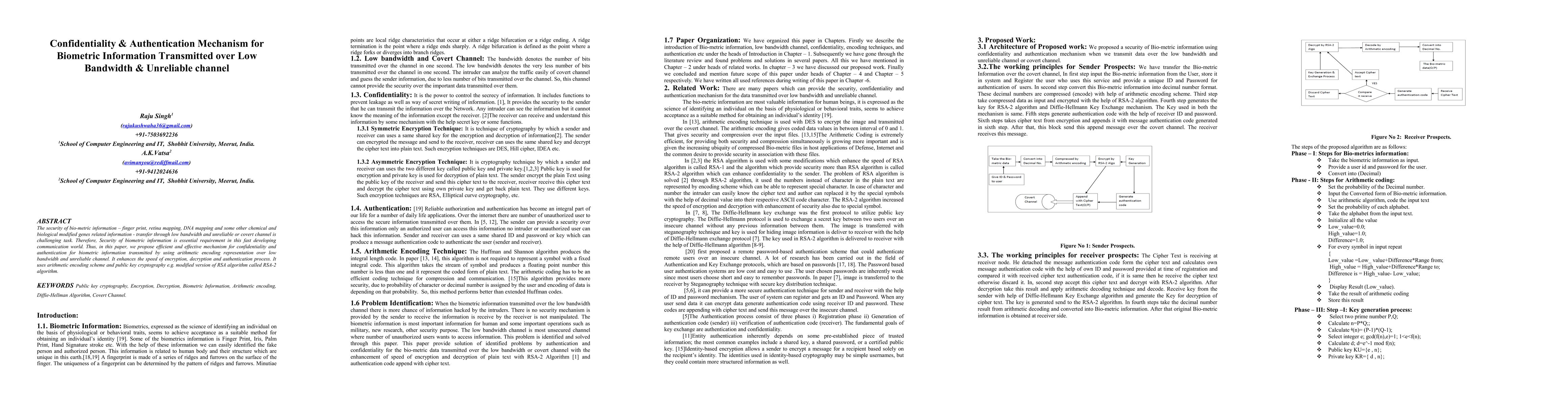 The security of bio-metric information - finger print, retina mapping, DNA mapping and some other chemical and biological modified genes related information - transfer through low bandwidth and unreliable or covert channel is challenging task. Therefore, Security of biometric information is essential requirement in this fast developing communication world. Thus, in this paper, we propose efficient and effective mechanism for confidentiality and authentication for biometric information transmitted by using arithmetic encoding representation over low bandwidth and unreliable channel. It enhances the speed of encryption, decryption and authentication process. It uses arithmetic encoding scheme and public key cryptography e.g. modified version of RSA algorithm called RSA-2 algorithm.