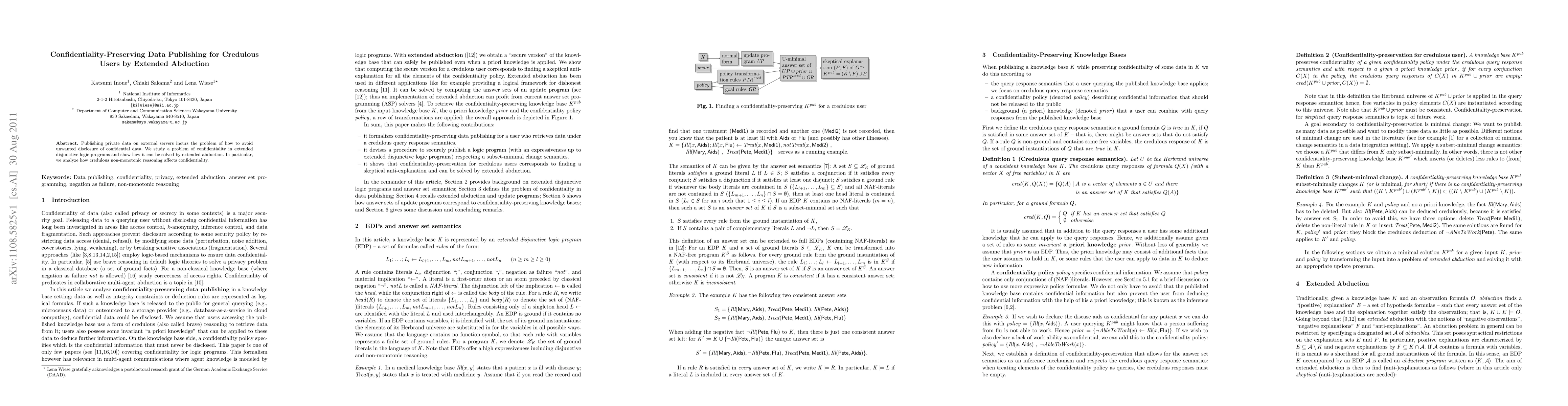 This paper investigates how to protect confidential data published on external servers using a logic programming approach called extended abduction. It finds that credulous non-monotonic reasoning can be used to ensure confidentiality.