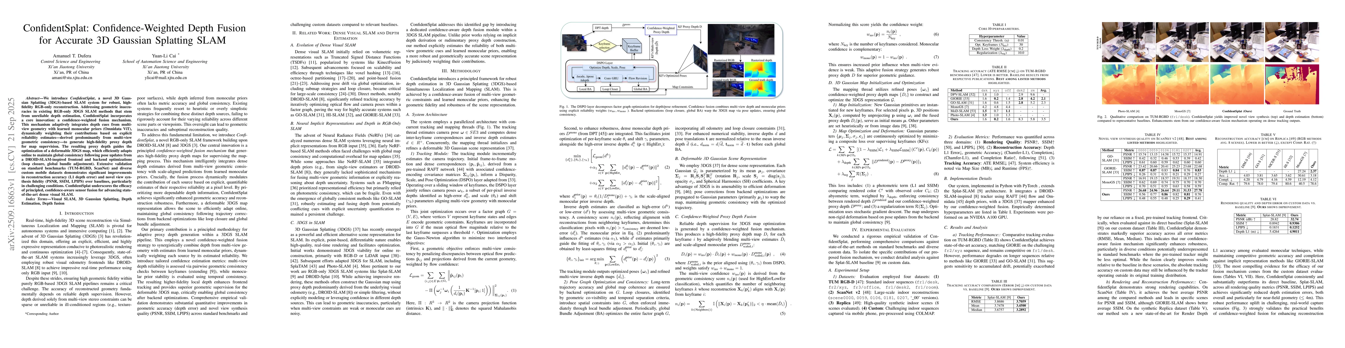 This research advances state-of-the-art dense visual SLAM by introducing a principled confidence-aware sensor fusion approach that enhances robustness and accuracy. The method's ability to handle geometric inaccuracies and improve reconstruction fidelity makes it particularly valuable for real-world applications requiring reliable spatial perception in uncontrolled environments.