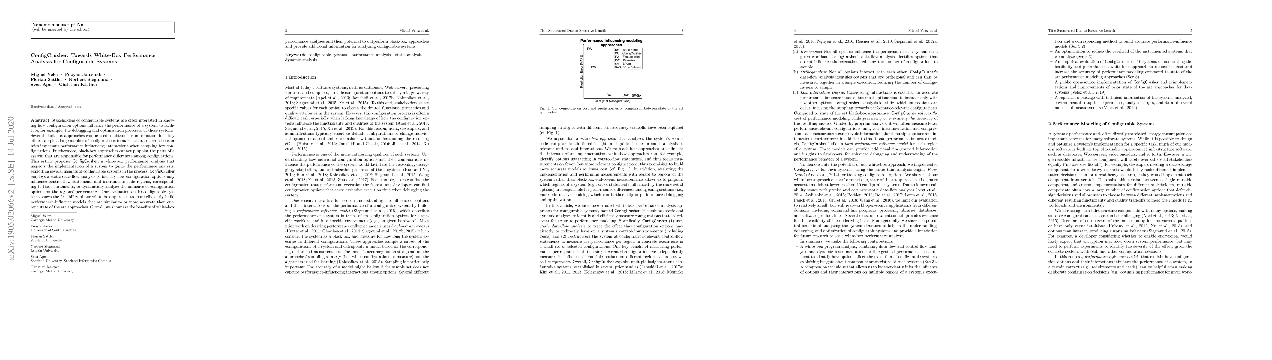 ConfigCrusher proposes a white-box performance analysis method to efficiently determine how configuration options affect system performance by inspecting the system's implementation and employing static data-flow analysis. The approach dynamically analyzes code regions influenced by configurations, demonstrating superior performance-model accuracy compared to black-box methods.