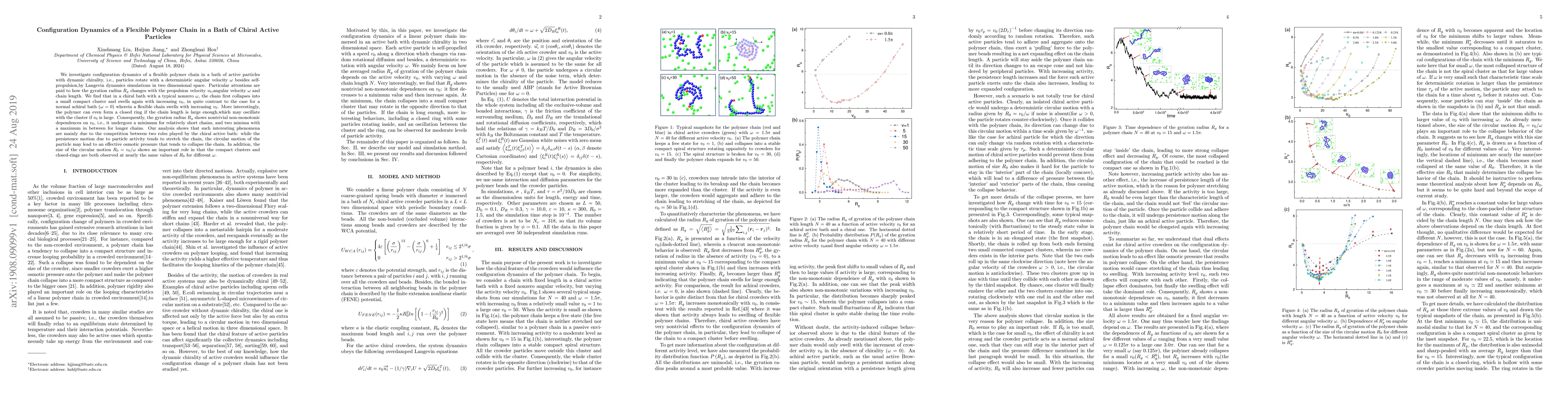 This study explores the configuration dynamics of a flexible polymer chain immersed in a bath of chiral active particles using Langevin dynamics simulations. The polymer's gyration radius $R_{g}$ changes non-monotonically with propulsion velocity $v_{0}$, angular velocity $\omega$, and chain length, revealing complex behaviors such as chain collapse, swelling, and ring formation, driven by the interplay between the particles' activity and chirality.
