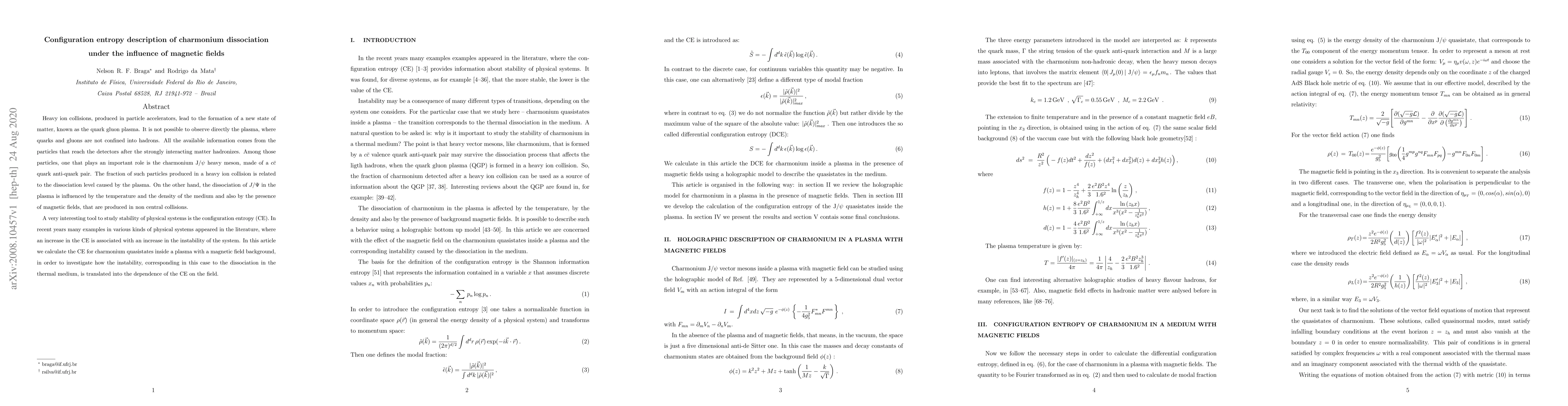 Heavy ion collisions, produced in particle accelerators, lead to the formation of a new state of matter, known as the quark gluon plasma. It is not possible to observe directly the plasma, where quarks and gluons are not confined into hadrons. All the available information comes from the particles that reach the detectors after the strongly interacting matter hadronizes. Among those particles, one that plays an important role is the charmonium J/$\psi$ heavy meson, made of a $ c \bar c$ quark anti-quark pair. The fraction of such particles produced in a heavy ion collision is related to the dissociation level caused by the plasma. On the other hand, the dissociation of $J/\Psi $ in the plasma is influenced by the temperature and the density of the medium and also by the presence of magnetic fields, that are produced in non central collisions. A very interesting tool to study stability of physical systems is the configuration entropy (CE). In recent years many examples in various kinds of physical systems appeared in the literature, where an increase in the CE is associated with an increase in the instability of the system. In this article we calculate the CE for charmonium quasistates inside a plasma with a magnetic field background, in order to investigate how the instability, corresponding in this case to the dissociation in the thermal medium, is translated into the dependence of the CE on the field.