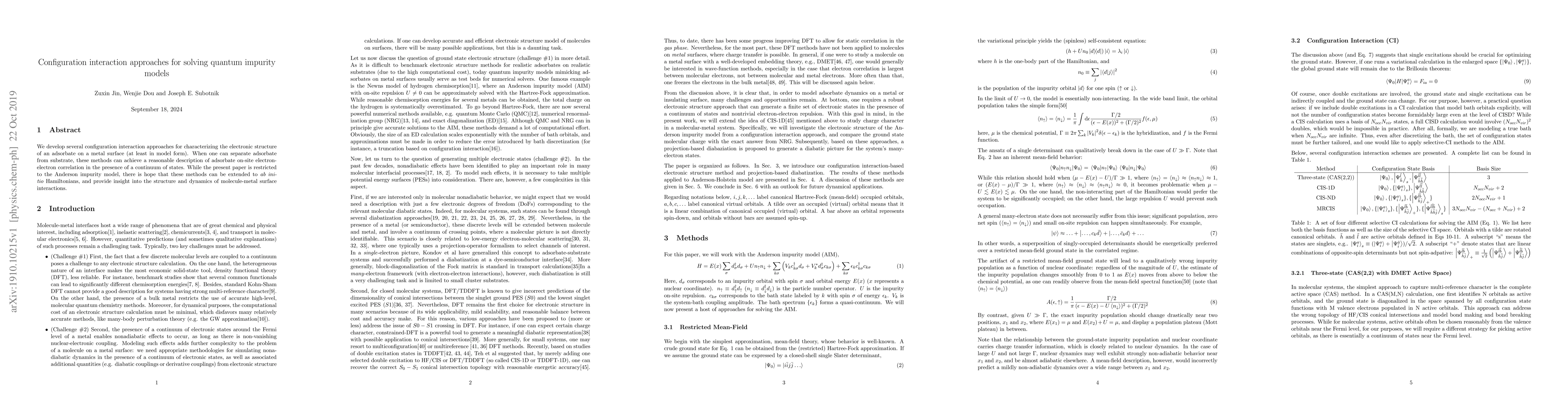 This paper introduces configuration interaction methods for solving quantum impurity models, specifically the Anderson impurity model, to characterize electronic structures of adsorbates on metal surfaces. These methods aim to describe on-site electron-electron correlations and may extend to ab initio Hamiltonians for deeper insights into molecule-metal interactions.