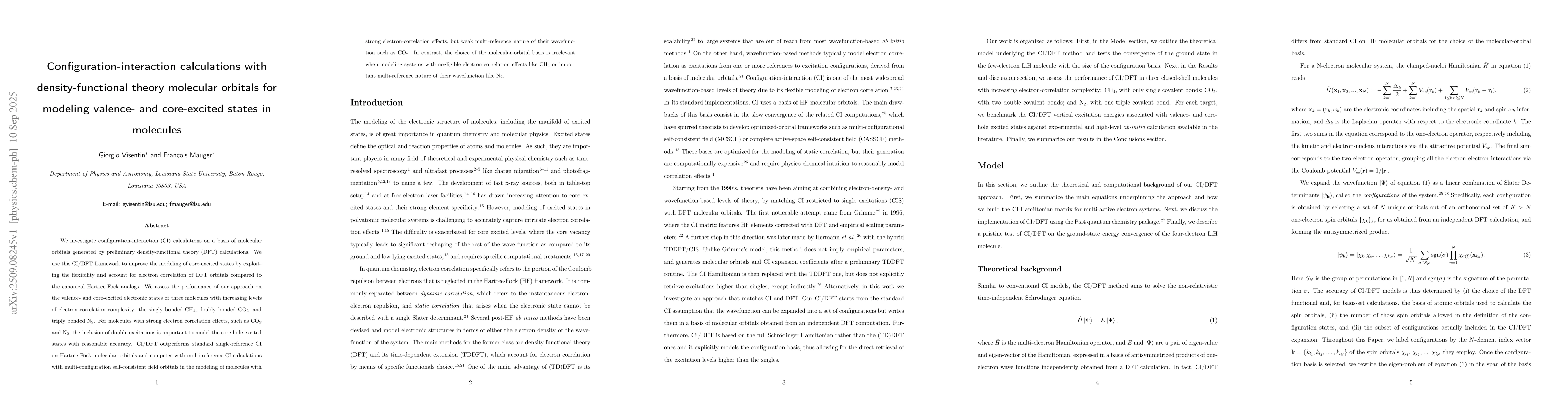 We investigate configuration-interaction (CI) calculations on a basis of molecular orbitals generated by preliminary density-functional theory (DFT) calculations. We use this CI/DFT framework to improve the modeling of core-excited states by exploiting the flexibility and account for electron correlation of DFT orbitals compared to the canonical Hartree-Fock analogs. We assess the performance of our approach on the valence- and core-excited electronic states of three molecules with increasing levels of electron-correlation complexity: the singly bonded CH4, doubly bonded CO2, and triply bonded N2. For molecules with strong electron correlation effects, such as CO2 and N2, the inclusion of double excitations is important to model the core-hole excited states with reasonable accuracy. CI/DFT outperforms standard single-reference CI on Hartree-Fock molecular orbitals and competes with multi-reference CI calculations with multi-configuration self-consistent field orbitals in the modeling of molecules with strong electron-correlation effects, but weak multi-reference nature of their wave function such as CO2. In contrast, the choice of the molecular-orbital basis is irrelevant when modeling systems with negligible electron-correlation effects like CH4 or important multi-reference nature of their wave function like N2.