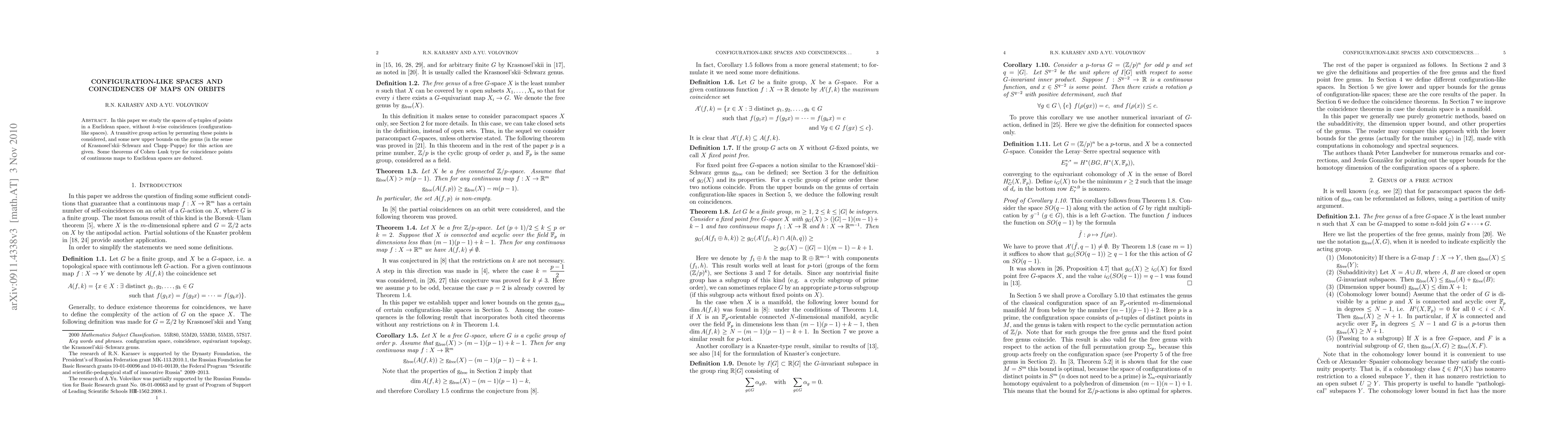 In this paper we study the spaces of $q$-tuples of points in a Euclidean space, without $k$-wise coincidences (configuration-like spaces). A transitive group action by permuting these points is considered, and some new upper bounds on the genus (in the sense of Krasnosel'skii--Schwarz and Clapp--Puppe) for this action are given. Some theorems of Cohen--Lusk type for coincidence points of continuous maps to Euclidean spaces are deduced.