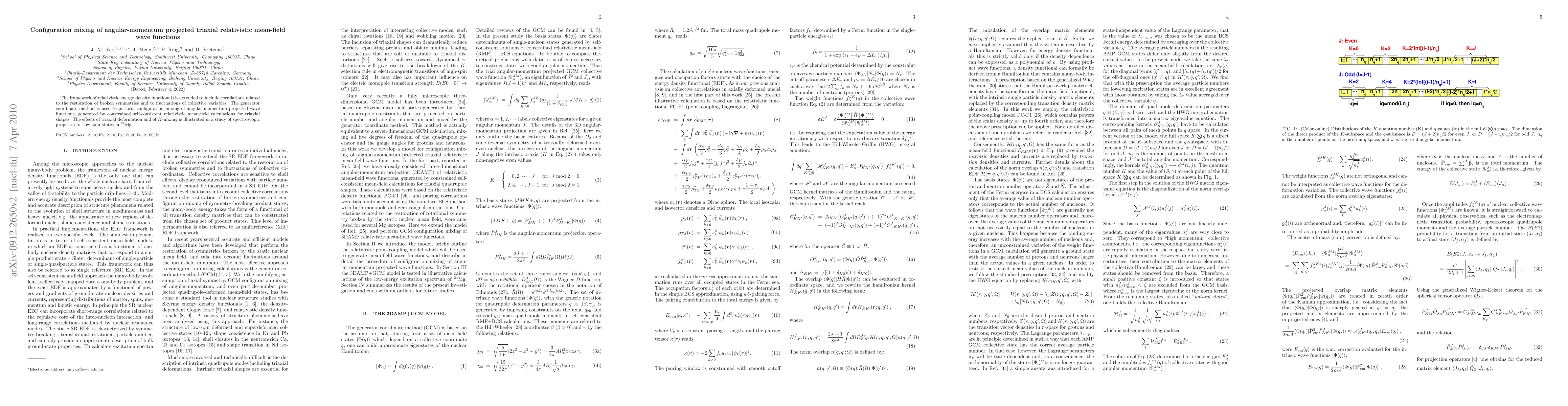 This paper extends relativistic mean-field theory to include configuration mixing and angular-momentum projection for triaxial shapes, demonstrating its application in analyzing the spectroscopic properties of low-spin states in $^{24}$Mg. The study highlights the impact of triaxial deformation and $K$-mixing on nuclear dynamics.