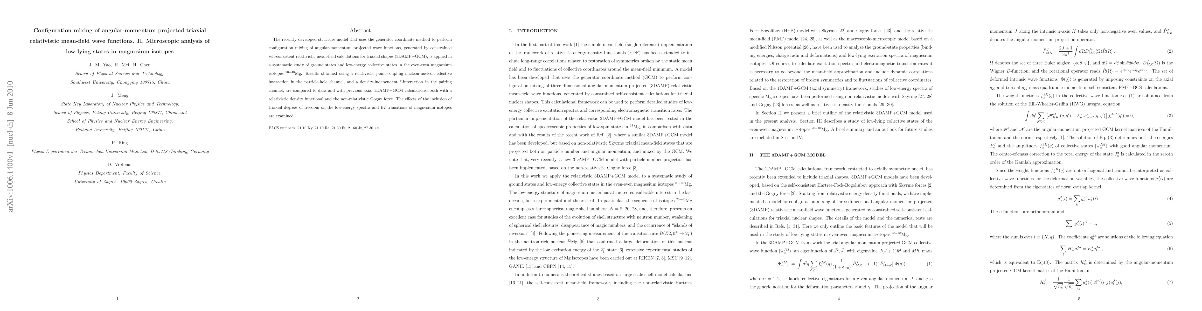 This paper applies a configuration mixing model using angular-momentum projected triaxial relativistic mean-field wave functions to analyze the low-lying states in magnesium isotopes. The results show the impact of triaxial degrees of freedom on the energy spectra and E2 transitions, compared to previous axial models and different effective interactions.