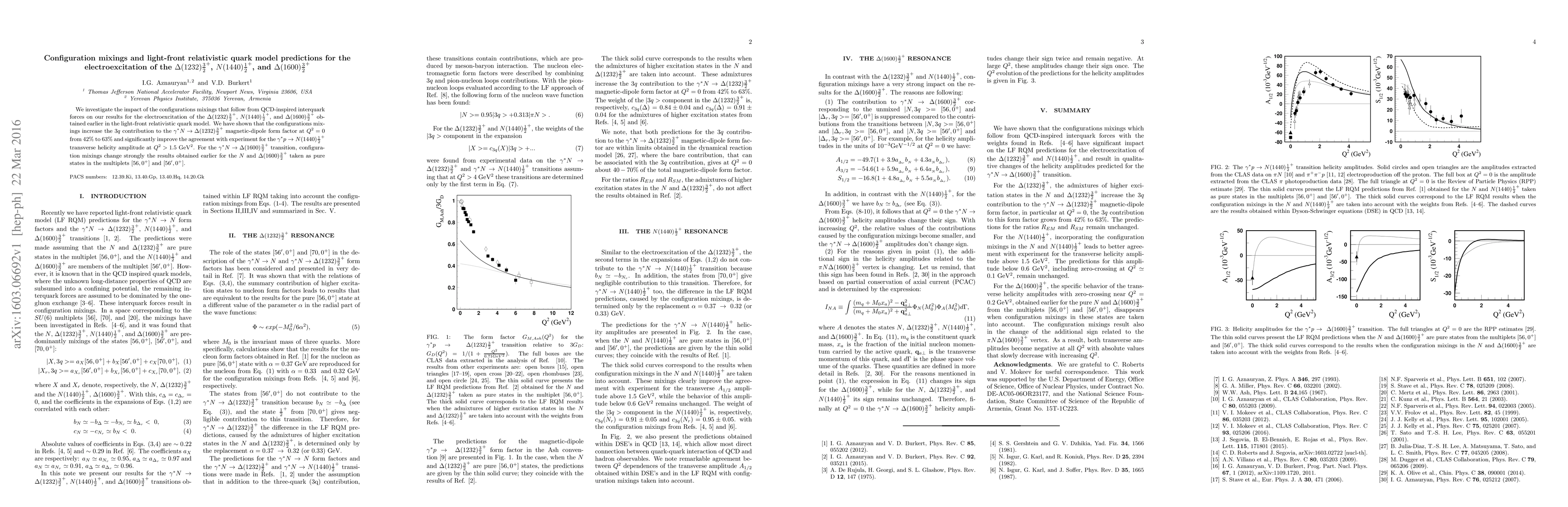 We investigate the impact of the configurations mixings that follow from QCD-inspired interquark forces on our results for the electroexcitation of the Delta(1232)3/2+, N(1440)1/2+, and Delta(1600)3/2+ obtained earlier in the light-front relativistic quark model. We have shown that the configurations mixings increase the 3q contribution to the gamma* N -> Delta(1232)3/2+ magnetic-dipole form factor at Q2=0 from 42% to 63% and significantly improve the agreement with experiment for the gamma* p -> N(1440)1/2+ transverse helicity amplitude at Q2 > 1.5GeV2. For the gamma* N -> Delta(1600)3/2+ transition, configuration mixings change strongly the results obtained earlier for the N and Delta(1600)3/2+ taken as pure states in the multiplets [56,0+] and [56',0+].