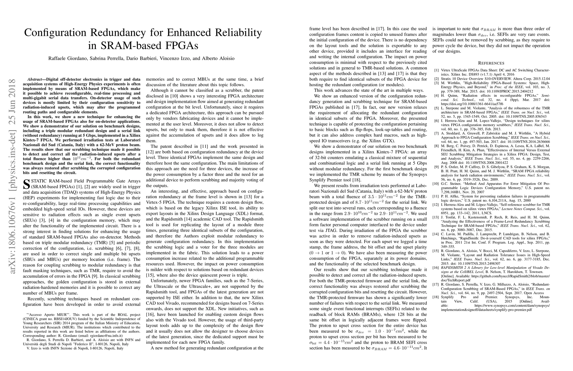 Digital off-detector electronics in trigger and data acquisition systems of High-Energy Physics experiments is often implemented by means of SRAM-based FPGAs, which make it possible to achieve reconfigurable, real-time processing and multi-gigabit serial data transfers. On-detector usage of such devices is mostly limited by their configuration sensitivity to radiation-induced upsets, which may alter the programmed routing paths and configurable elements. In this work, we show a new technique for enhancing the usage of SRAM-based FPGAs also for on-detector applications. We show a demonstrator of our solution on benchmark designs, including a triple modular redundant design and a serial link (without redundancy) running at 5 Gbps, implemented in a Xilinx Kintex-7 FPGA. We performed irradiation tests at Laboratori Nazionali del Sud (Catania, Italy) with a 62-MeV proton beam. The results show that our scrubbing technique made it possible to detect and correct all the radiation-induced upsets after a total fluence higher than $10^{12}cm^{-2}$. For both the redundant benchmark design and the serial link, the correct functionality was always restored after scrubbing the corrupted configuration bits and resetting the circuit.