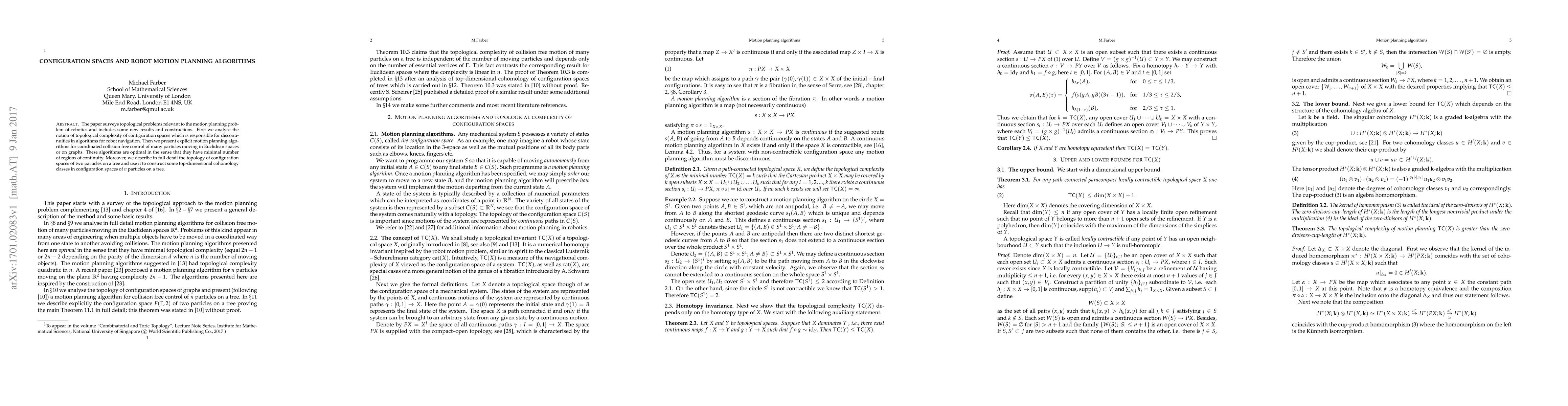 The paper surveys topological problems relevant to the motion planning problem of robotics and includes some new results and constructions. First we analyse the notion of topological complexity of configuration spaces which is responsible for discontinuities in algorithms for robot navigation. Then we present explicit motion planning algorithms for coordinated collision free control of many particles moving in Euclidean spaces or on graphs. These algorithms are optimal in the sense that they have minimal number of regions of continuity. Moreover, we describe in full detail the topology of configuration spaces of two particles on a tree and use it to construct some top-dimensional cohomology classes in configuration spaces of n particles on a tree.
