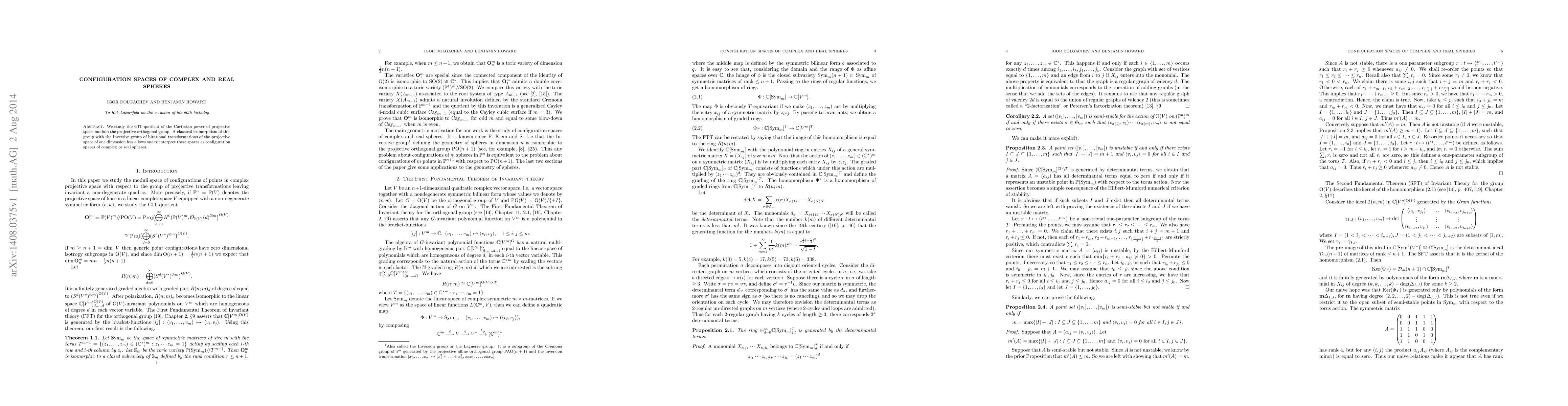 This paper explores the GIT-quotient of projective space powers under the projective orthogonal group, revealing an isomorphism with the Inversive group, and interprets these quotients as configuration spaces of complex or real spheres.