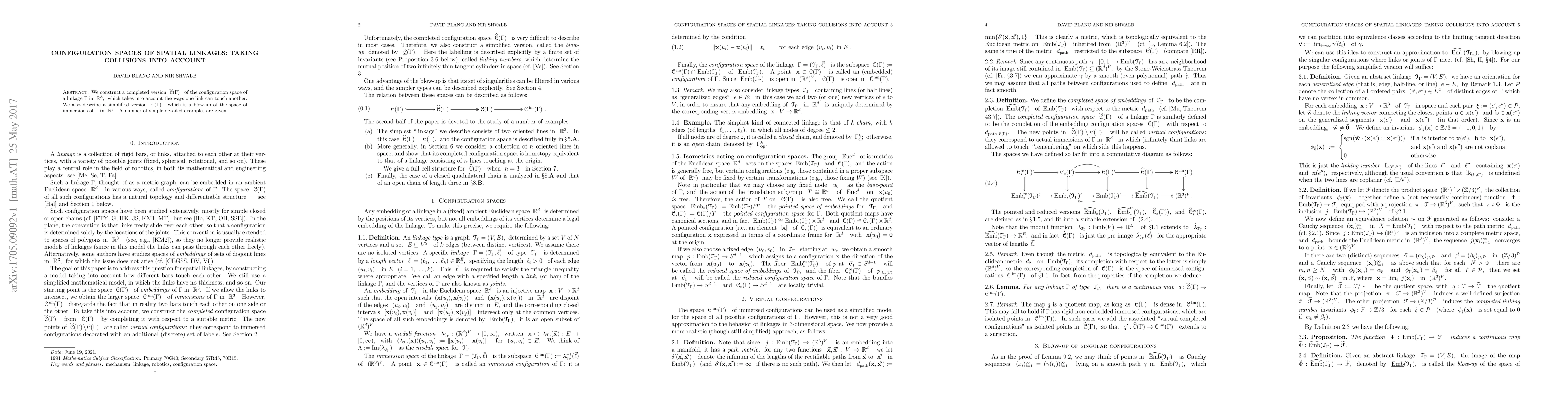 We construct a completed version C(Gamma) of the configuration space of a linkage Gamma in R^3 which takes into account the ways one link can touch another. We also describe a simplified version of C(Gamma) which is a blow-up of the space of immersions of Gamma in R^3 A number of simple detailed examples are given.