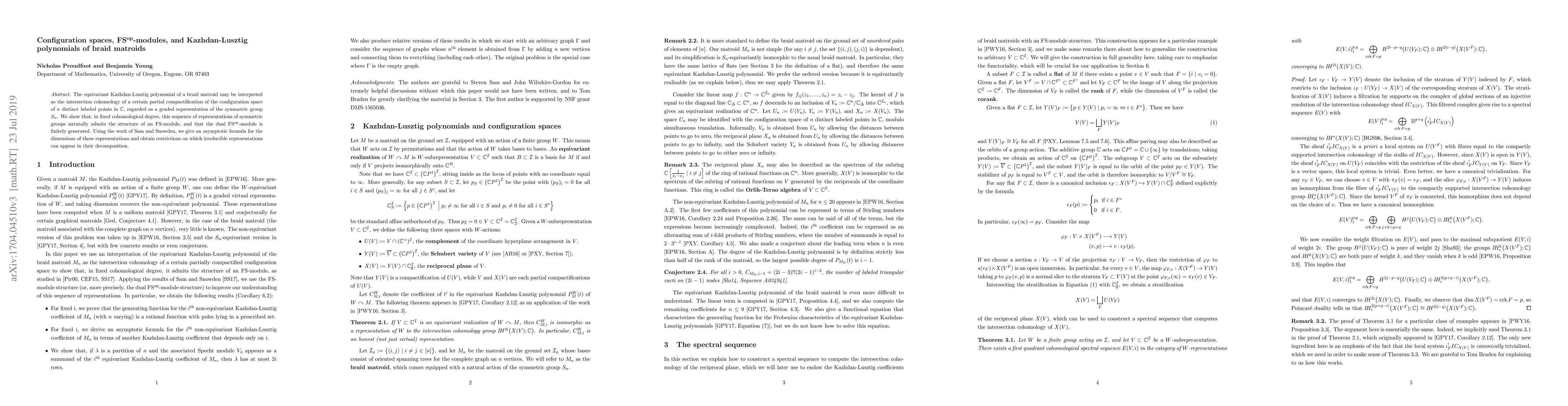 This paper explores the equivariant Kazhdan-Lusztig polynomials of braid matroids, linking them to the intersection cohomology of a configuration space of labeled points. It demonstrates that these polynomials form an FS-module in a specific cohomological degree and proves the finite generation of the dual FS^op-module. Additionally, it provides an asymptotic formula for the dimensions of these representations and identifies constraints on their irreducible decompositions.