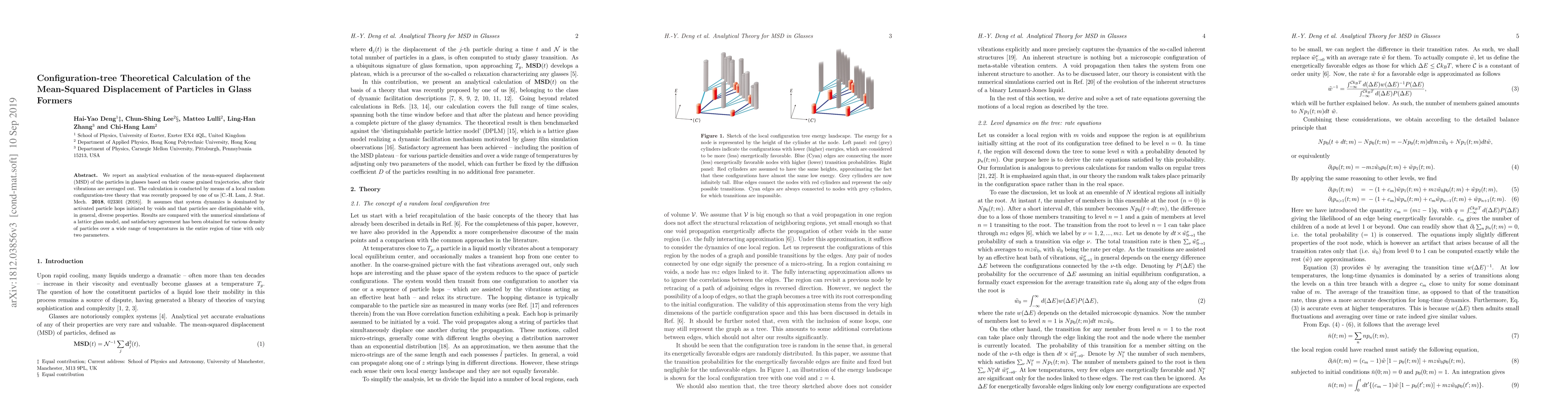This research introduces a novel local random configuration-tree theory to analytically evaluate the mean-squared displacement (MSD) of particles in glasses, achieving good agreement with lattice glass model simulations over a wide temperature range without adjustable parameters. This calculation is considered the first of its kind.