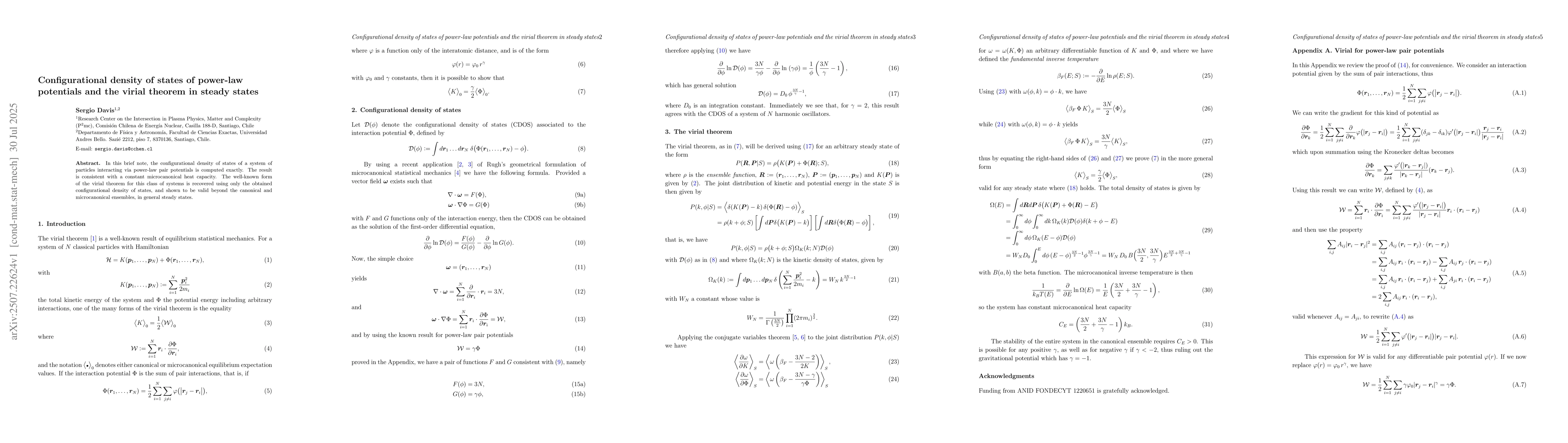 The main technical contribution is the exact computation of the configurational density of states for power-law potentials and the extension of the virial theorem to general steady states using this CDOS.