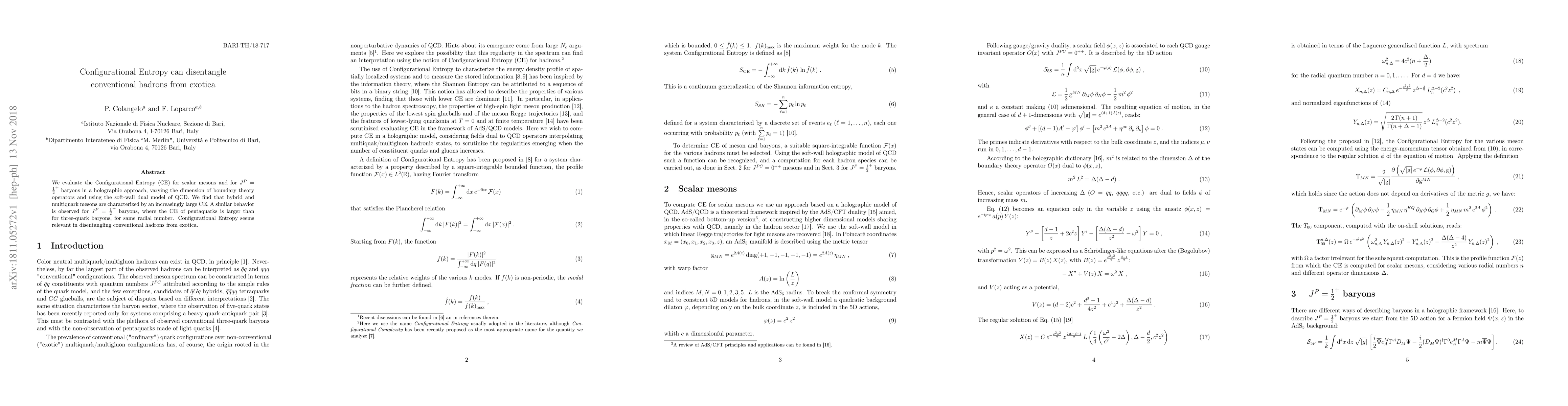 We evaluate the Configurational Entropy (CE) for scalar mesons and for $J^P=\frac{1}{2}^+$ baryons in a holographic approach, varying the dimension of boundary theory operators and using the soft-wall dual model of QCD. We find that hybrid and multiquark mesons are characterized by an increasingly large CE. A similar behavior is observed for $J^P=\frac{1}{2}^+$ baryons, where the CE of pentaquarks is larger than for three-quark baryons, for same radial number. Configurational Entropy seems relevant in disentangling conventional hadrons from exotica.