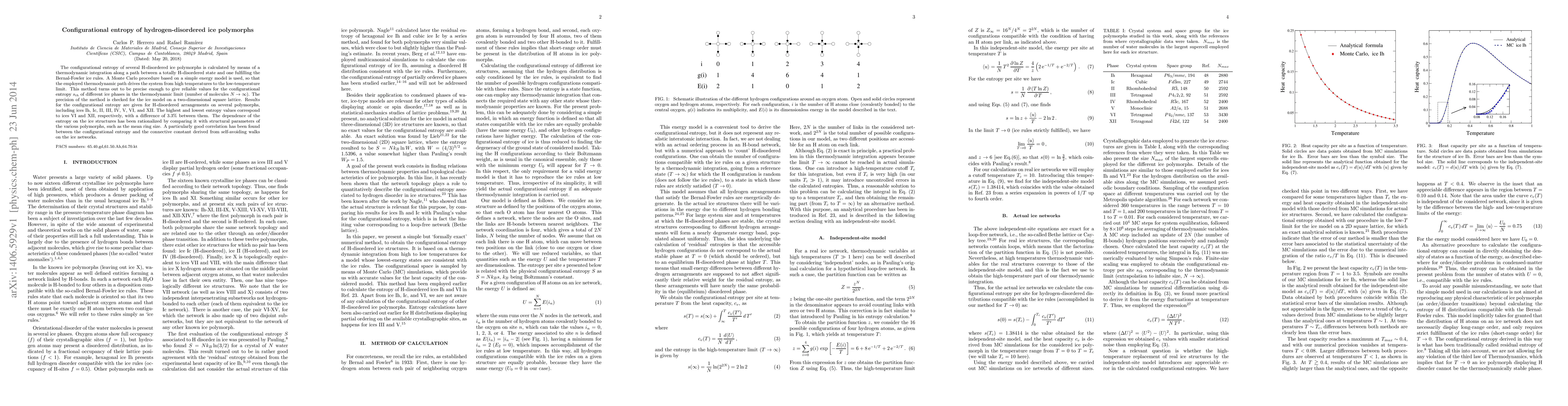 The configurational entropy of several H-disordered ice polymorphs is calculated by means of a thermodynamic integration along a path between a totally H-disordered state and one fulfilling the Bernal-Fowler ice rules. A Monte Carlo procedure based on a simple energy model is used, so that the employed thermodynamic path drives the system from high temperatures to the low-temperature limit. This method turns out to be precise enough to give reliable values for the configurational entropy of different ice phases in the thermodynamic limit (number of molecules N --> infinity). The precision of the method is checked for the ice model on a two-dimensional square lattice. Results for the configurational entropy are given for H-disordered arrangements on several polymorphs, including ices Ih, Ic, II, III, IV, V, VI, and XII. The highest and lowest entropy values correspond to ices VI and XII, respectively, with a difference of 3.3\% between them. The dependence of the entropy on the ice structures has been rationalized by comparing it with structural parameters of the various polymorphs, such as the mean ring size. A particularly good correlation has been found between the configurational entropy and the connective constant derived from self-avoiding walks on the ice networks.