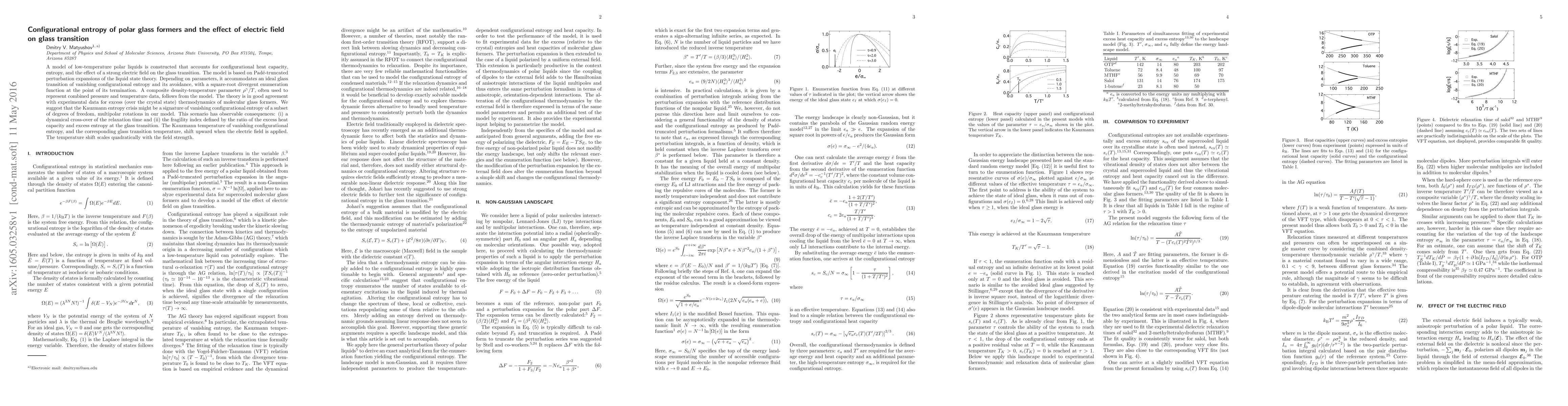 A model of low-temperature polar liquids is constructed that accounts for configurational heat capacity, entropy, and the effect of a strong electric field on the glass transition. The model is based on Pad{\'e}-truncated perturbation expansions of the liquid state theory. Depending on parameters, it accommodates an ideal glass transition of vanishing configurational entropy and its avoidance, with a square-root divergent enumeration function at the point of its termination. A composite density-temperature parameter $\rho^\gamma/T$, often used to represent combined pressure and temperature data, follows from the model. The theory is in good agreement with experimental data for excess (over the crystal state) thermodynamics of molecular glass formers. We suggest that the Kauzmann entropy crisis might be a signature of vanishing configurational entropy of a subset of degrees of freedom, multipolar rotations in our model. This scenario has observable consequences: (i) a dynamical cross-over of the relaxation time and (ii) the fragility index defined by the ratio of the excess heat capacity and excess entropy at the glass transition. The Kauzmann temperature of vanishing configurational entropy, and the corresponding glass transition temperature, shift upward when the electric field is applied. The temperature shift scales quadratically with the field strength.