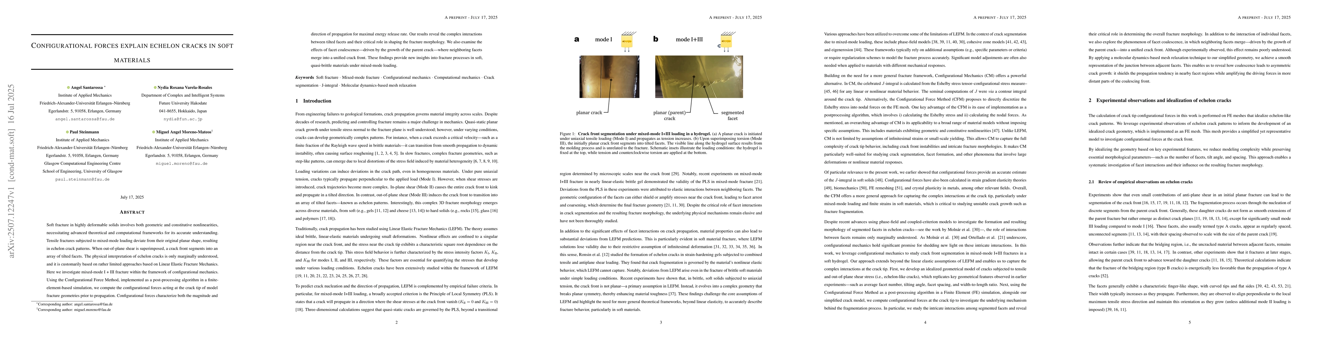 This research uses the Configurational Force Method in finite-element simulations to explain the complex echelon crack patterns in soft materials under mixed-mode loading. It reveals how configurational forces dictate crack propagation direction and magnitude, highlighting the critical role of tilted facets in shaping fracture morphology.