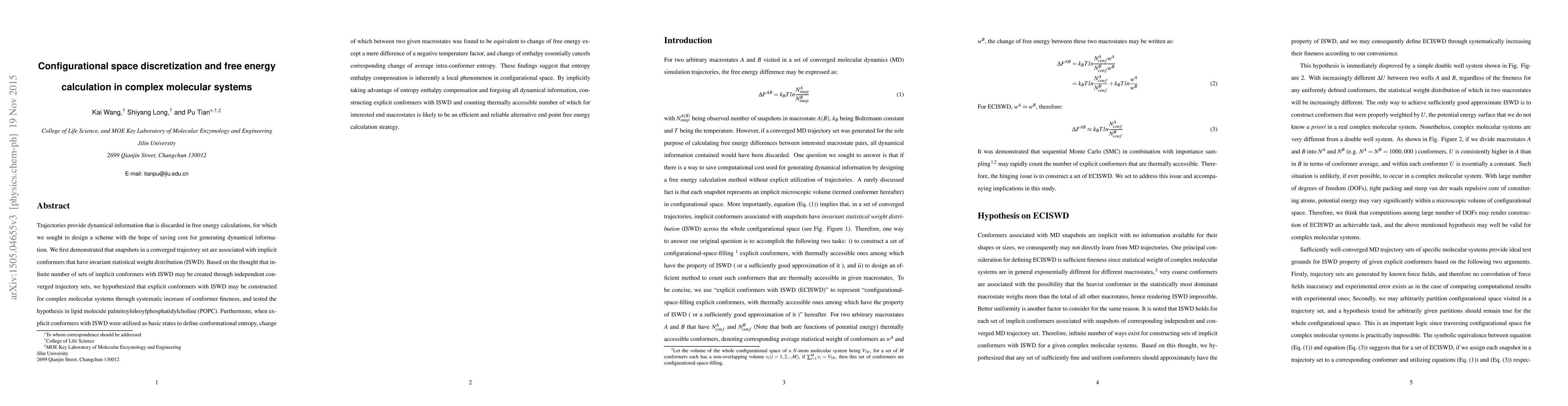 This paper proposes a method to calculate free energy in complex molecular systems by discretizing configurational space into explicit conformers with invariant statistical weight distribution (ISWD), leveraging entropy-enthalpy compensation to bypass the need for dynamic trajectory data. The approach was tested on the lipid molecule POPC, demonstrating its potential as an efficient alternative to traditional free energy calculation methods.