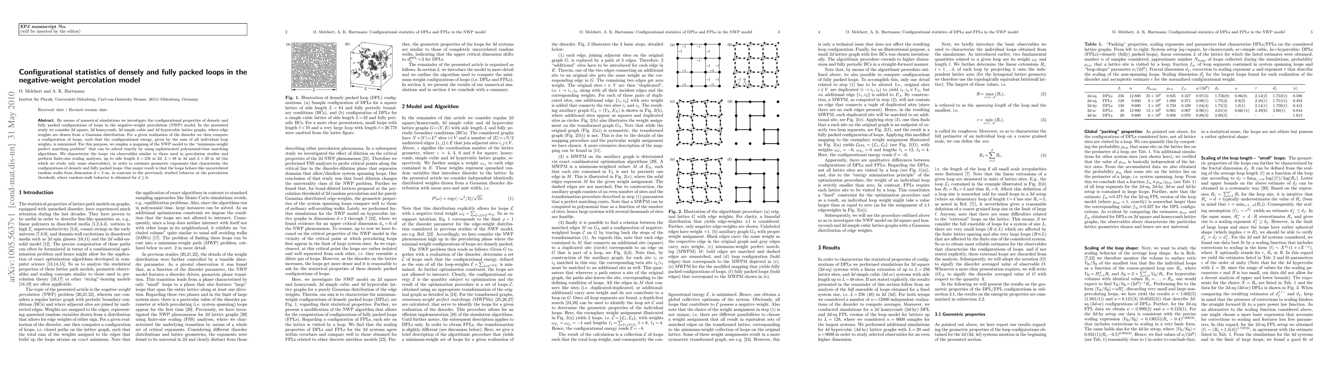 This paper investigates the configurational statistics of densely packed loops in the negative-weight percolation model using numerical simulations across various lattice dimensions. It finds that loops behave like uncorrelated random walks starting from dimension d=3, contrasting with previous findings where this behavior was observed at d>=6.