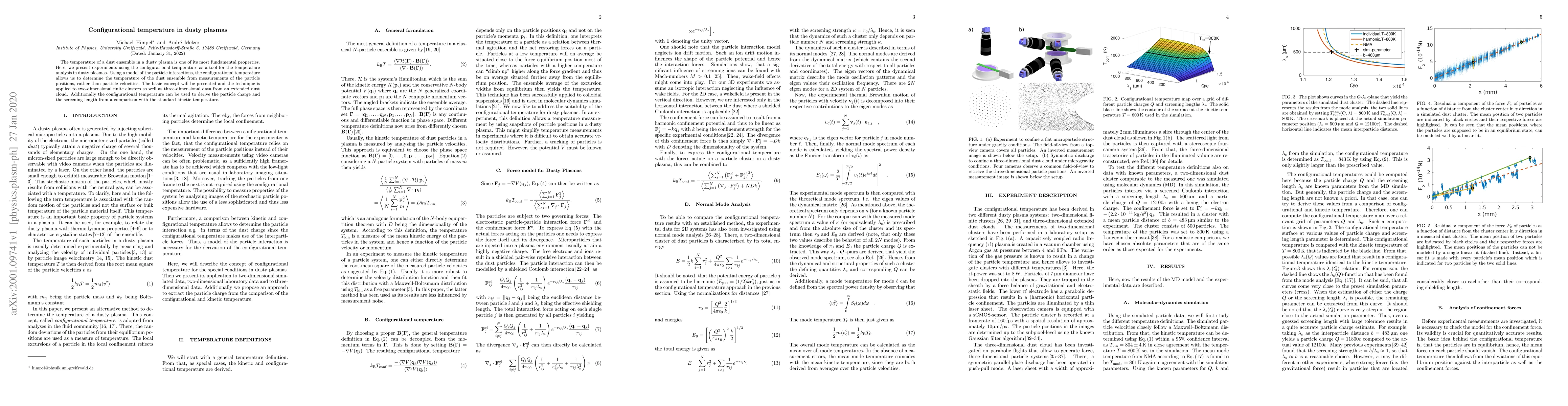 The temperature of a dust ensemble in a dusty plasma is one of its most fundamental properties. Here, we present experiments using the configurational temperature as a for the temperature analysis in dusty plasmas. Using a model of the particle interactions, the configurational temperature allows us to determine the temperature of the dust ensemble from measurements of the particle positions, rather than particle velocities. The basic concept will be presented and the technique is applied to two-dimensional finite clusters as well as three-dimensional data from an extended dust cloud. Additionally, the configurational temperature can be used to derive the particle charge and the screening length from a comparison with the standard kinetic temperature.