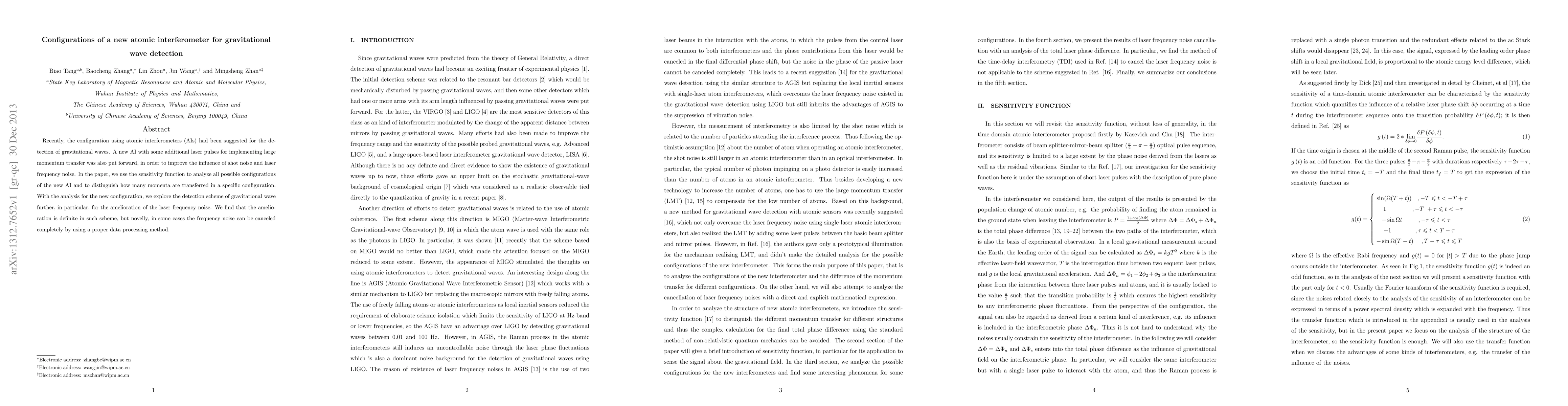 Recently, the configuration using atomic interferometers (AIs) had been suggested for the detection of gravitational waves. A new AI with some additional laser pulses for implementing large momentum transfer was also put forward, in order to improve the influence of shot noise and laser frequency noise. In the paper, we use the sensitivity function to analyze all possible configurations of the new AI and to distinguish how many momenta are transferred in a specific configuration. With the analysis for the new configuration, we explore the detection scheme of gravitational wave further, in particular, for the amelioration of the laser frequency noise. We find that the amelioration is definite in such scheme, but novelly, in some cases the frequency noise can be canceled completely by using a proper data processing method.