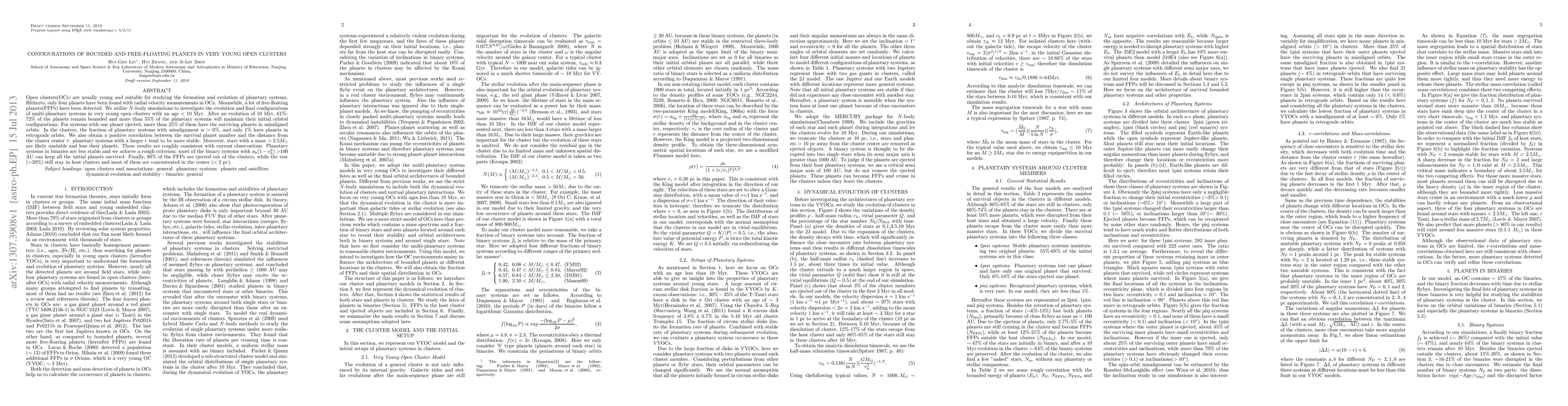 Open clusters(OCs) are usually young and suitable for studying the formation and evolution of planetary systems. Hitherto, only four planets have been found with radial velocity measurements in OCs. Meanwhile, a lot of free-floating planets(FFPs) have been detected. We utilize N-body simulations to investigate the evolution and final configurations of multi-planetary systems in very young open clusters with an age <10 Myr. After an evolution of 10 Myr, 61%-72% of the planets remain bounded and more than 55% of the planetary systems will maintain their initial orbital configurations. For systems with one planet ejected, more than 25% of them have the surviving planets in misaligned orbits. In the clusters, the fraction of planetary systems with misalignment is > 6%, and only 1% have planets in retrograde orbits. We also obtain a positive correlation between the survival planet number and the distance from the cluster center $r$: planetary systems with a larger $r$ tend to be more stable. Moreover, stars with a mass >2.5 $M_\odot$ are likely unstable and lose their planets. These results are roughly consistent with current observations. Planetary systems in binaries are less stable and we achieve a rough criterion: most of the binary systems with $a_{\rm b}(1-e_{\rm b}^2)$>100 AU can keep all the initial planets survived. Finally, 80% of the FFPs are ejected out of the clusters, while the rest (~20%) still stay in host clusters and most of them are concentrated in the center (<2 pc).
