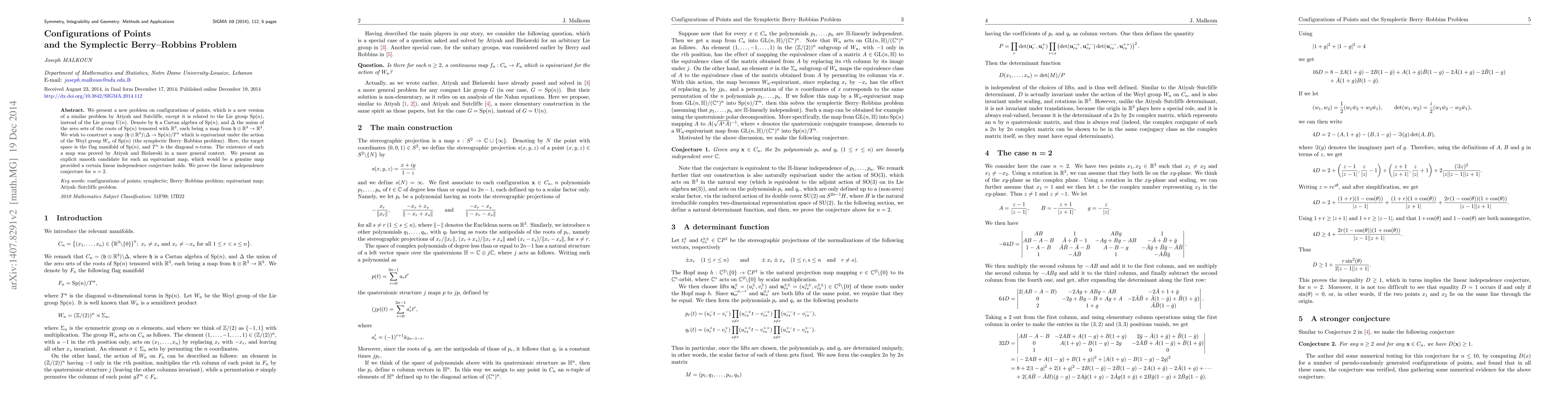 This paper introduces a novel problem concerning configurations of points linked to the Lie group Sp(n), expanding on a previous work by Atiyah and Sutcliffe related to U(n). The authors present an explicit candidate for an equivariant map under Weyl group action, proving a linear independence conjecture for n=2, which supports the existence of such a map as proven in a broader context by Atiyah and Bielawski.