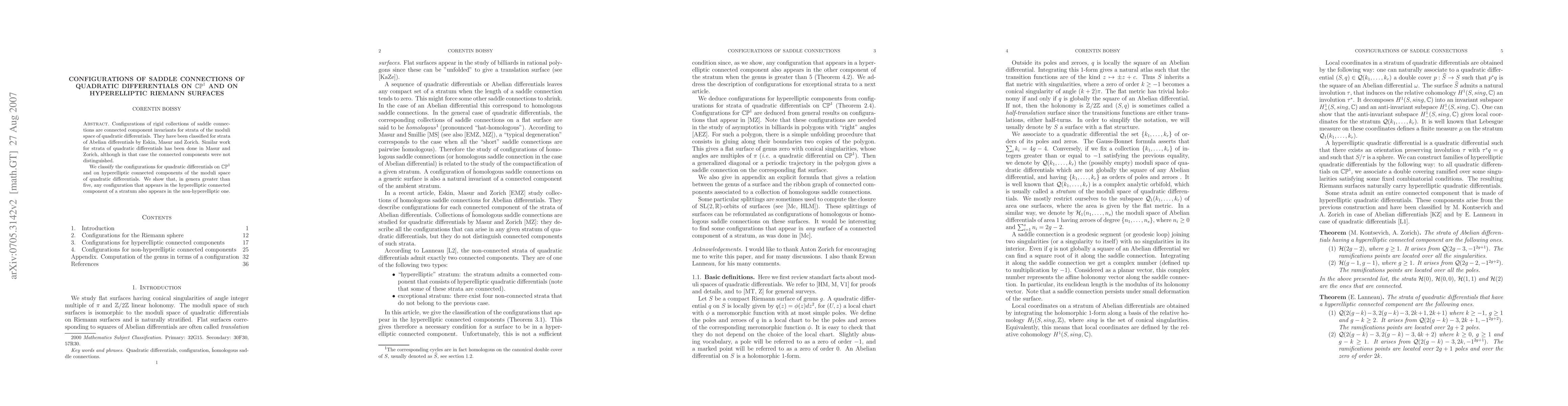 This paper classifies configurations of saddle connections for quadratic differentials on the Riemann sphere and hyperelliptic Riemann surfaces, showing that configurations appearing in hyperelliptic strata also occur in non-hyperelliptic strata for genera greater than five. This extends previous classification work for Abelian differentials.