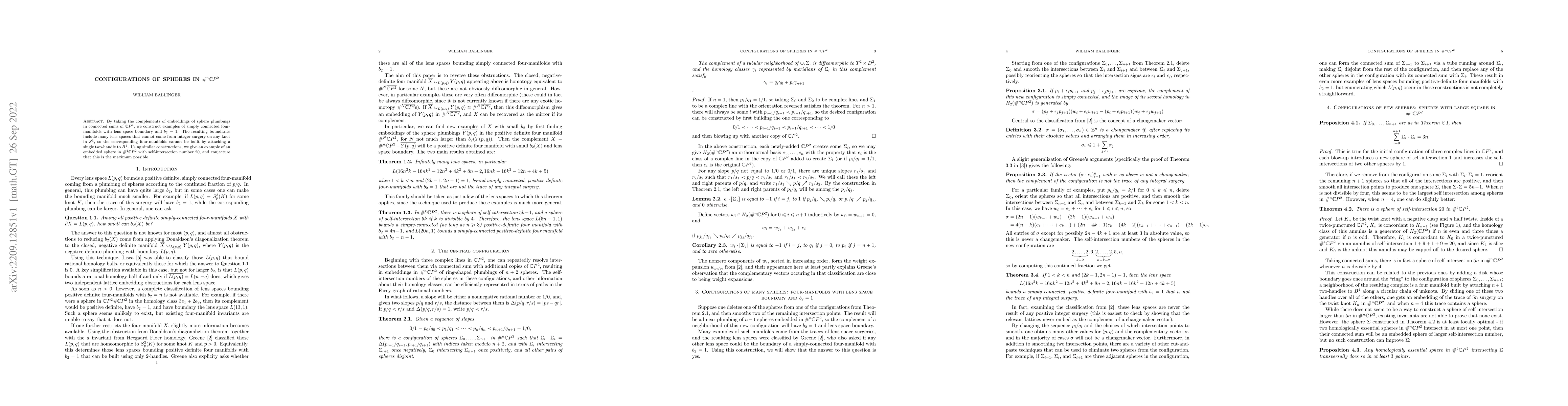 This paper constructs simply connected four-manifolds with lens space boundaries and $b_2 = 1$ by removing sphere plumbings from connected sums of $\mathbb{C} P^2$. It also presents an embedded sphere in $\#^4 \mathbb{C} P^2$ with self-intersection number $20$, suggesting this may be the maximum possible value.