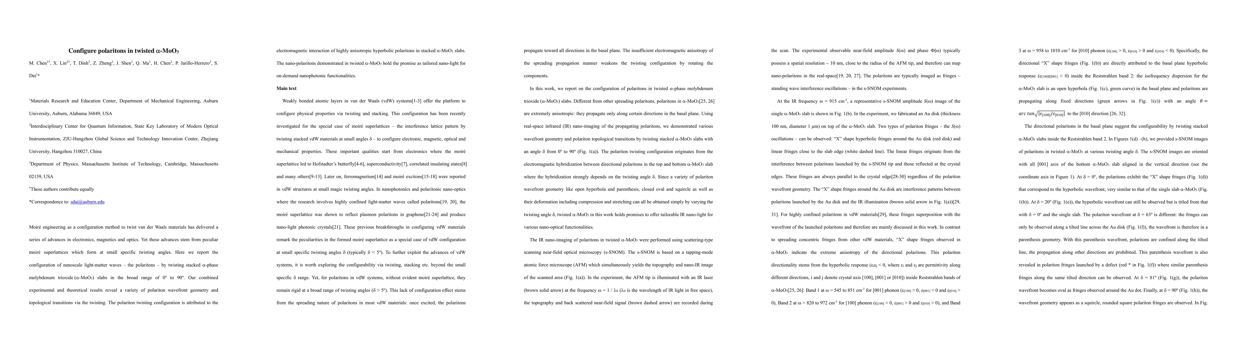 This study configures polaritons in twisted $\alpha$-MoO3 using moire engineering, demonstrating varied polariton wavefront geometry and topological transitions across a wide range of twisting angles. The twisting reconfigures electromagnetic interactions in the stacked slabs, promising tailored nanophotonic functionalities.