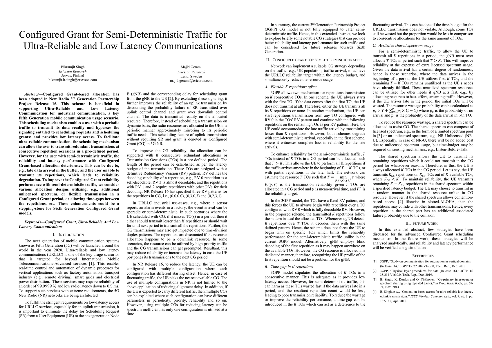 Configured Grant-based allocation has been adopted in New Radio 3rd Generation Partnership Project Release 16. This scheme is beneficial in supporting Ultra-Reliable and Low Latency Communication for industrial communication, a key Fifth Generation mobile communication usage scenario. This scheduling mechanism enables a user with a periodic traffic to transmit its data readily and bypasses the signaling entailed to scheduling requests and scheduling grants; and provides low latency access. To facilitate ultra-reliable communication, the scheduling mechanism can allow the user to transmit redundant transmissions at consecutive repetition occasions in a pre-defined period. However, for the user with semi-deterministic traffic, the reliability and latency performance with Configured Grant-based allocation deteriorates. This can be due to, e.g., late data arrival in the buffer, and the user unable to transmit its repetitions, which leads to reliability degradation. To improve the Configured Grant reliability performance with semi-deterministic traffic, we consider various allocation designs utilizing, e.g., additional unlicensed spectrum, or flexible transmission in a Configured Grant period, or allowing time-gaps between the repetitions, etc. These enhancements could be a stepping-stone for Sixth Generation Configured Grant models.