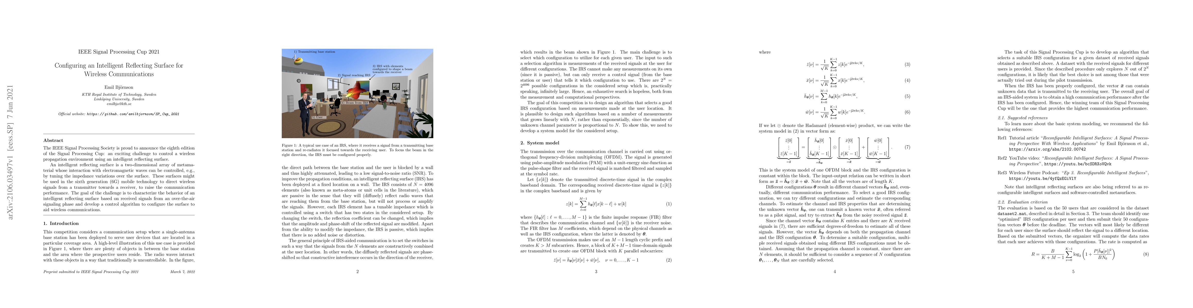 The IEEE Signal Processing Society is proud to announce the eighth edition of the Signal Processing Cup: an exciting challenge to control a wireless propagation environment using an intelligent reflecting surface. An intelligent reflecting surface is a two-dimensional array of metamaterial whose interaction with electromagnetic waves can be controlled, e.g., by tuning the impedance variations over the surface. These surfaces might be used in the sixth generation (6G) mobile technology to direct wireless signals from a transmitter towards a receiver, to raise the communication performance. The goal of the challenge is to characterize the behavior of an intelligent reflecting surface based on received signals from an over-the-air signaling phase and develop a control algorithm to configure the surface to aid wireless communications.