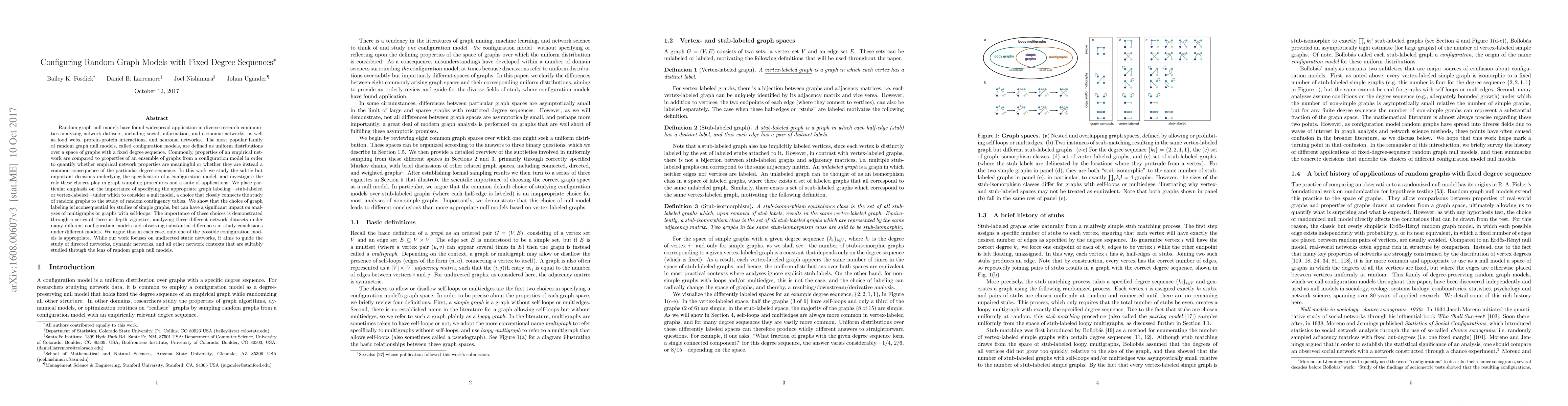 Researchers studied how to configure random graph models with fixed degree sequences, finding that choosing between stub-labeled and vertex-labeled graphs significantly impacts results, especially in multigraphs or networks with self-loops.