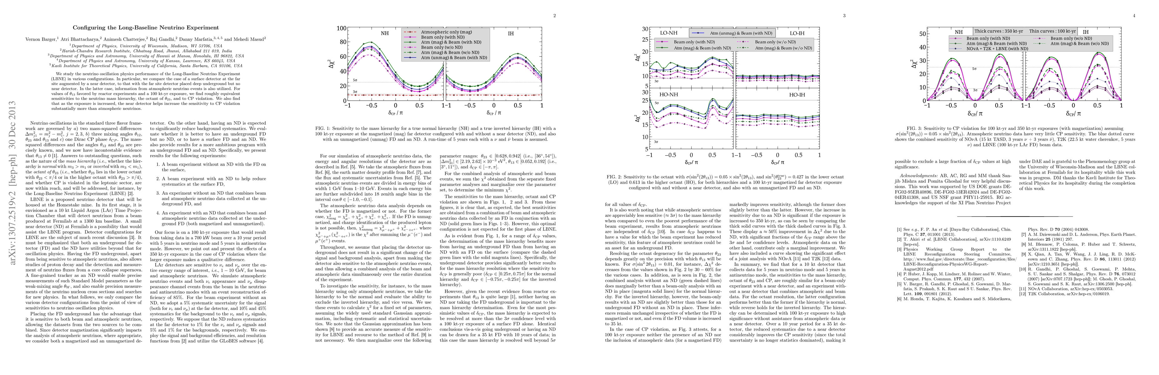 We study the neutrino oscillation physics performance of the Long-Baseline Neutrino Experiment (LBNE) in various configurations. In particular, we compare the case of a surface detector at the far site augmented by a near detector, to that with the far site detector placed deep underground but no near detector. In the latter case, information from atmospheric neutrino events is also utilized. For values of \theta_{13} favored by reactor experiments and a 100 kt-yr exposure, we find roughly equivalent sensitivities to the neutrino mass hierarchy, the octant of \theta_{23}, and to CP violation. We also find that as the exposure is increased, the near detector helps increase the sensitivity to CP violation substantially more than atmospheric neutrinos.
