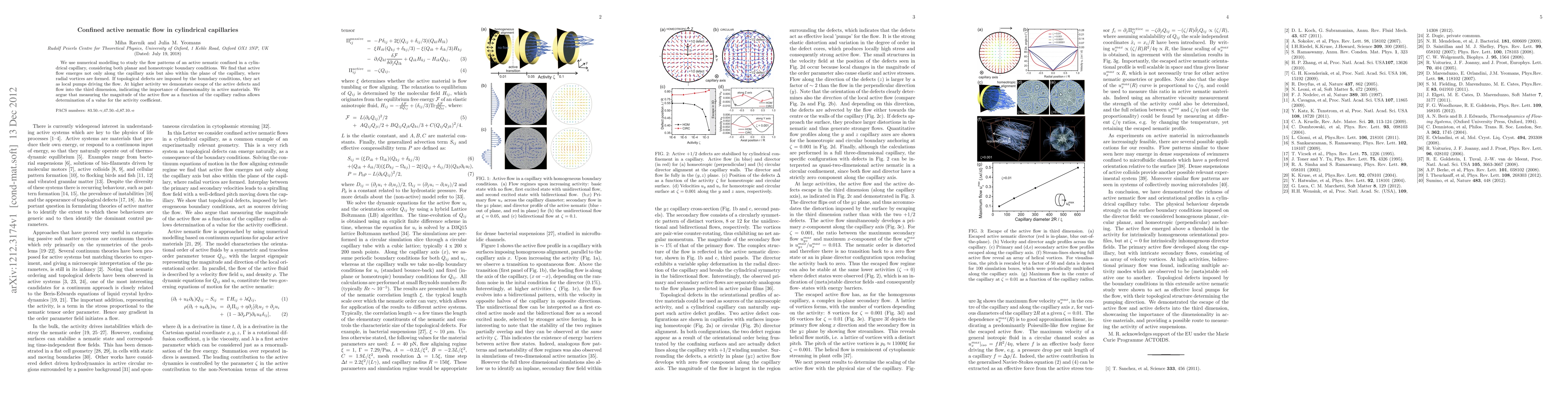 This study uses numerical modelling to explore active nematic flow in cylindrical capillaries, revealing radial vortices and the emergence of active flow within the plane, driven by topological defects. The research indicates the significance of dimensionality in active materials and proposes a method to determine the activity coefficient by measuring flow magnitude relative to capillary radius.
