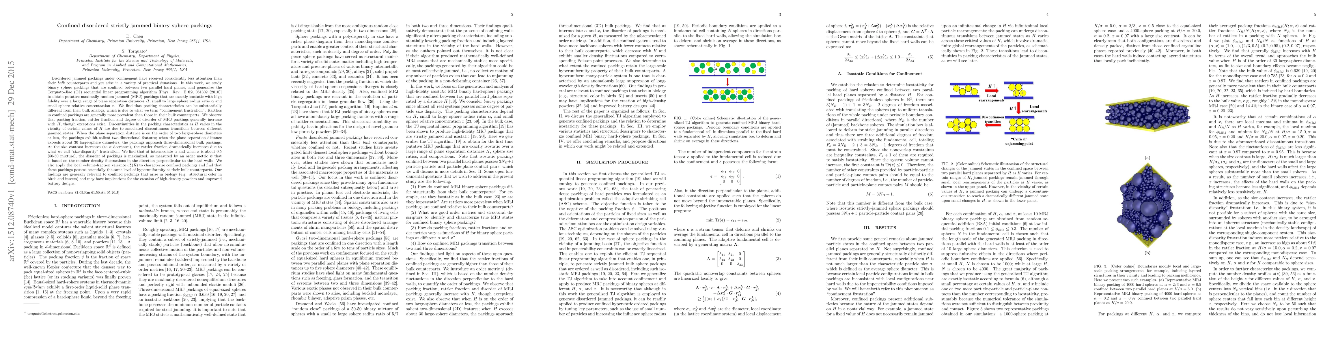 Disordered jammed packings under confinement have received considerably less attention than their \textit{bulk} counterparts and yet arise in a variety of practical situations. In this work, we study binary sphere packings that are confined between two parallel hard planes, and generalize the Torquato-Jiao (TJ) sequential linear programming algorithm [Phys. Rev. E {\bf 82}, 061302 (2010)] to obtain putative maximally random jammed (MRJ) packings that are exactly isostatic with high fidelity over a large range of plane separation distances $H$, small to large sphere radius ratio $\alpha$ and small sphere relative concentration $x$. We find that packing characteristics can be substantially different from their bulk analogs, which is due to what we term "confinement frustration". Rattlers in confined packings are generally more prevalent than those in their bulk counterparts. We observe that packing fraction, rattler fraction and degree of disorder of MRJ packings generally increase with $H$, though exceptions exist. Discontinuities in the packing characteristics as $H$ varies in the vicinity of certain values of $H$ are due to associated discontinuous transitions between different jammed states. We also apply the local volume-fraction variance $\sigma_{\tau}^2(R)$ to characterize confined packings and find that these packings possess essentially the same level of hyperuniformity as their bulk counterparts. Our findings are generally relevant to confined packings that arise in biology (e.g., structural color in birds and insects) and may have implications for the creation of high-density powders and improved battery designs.