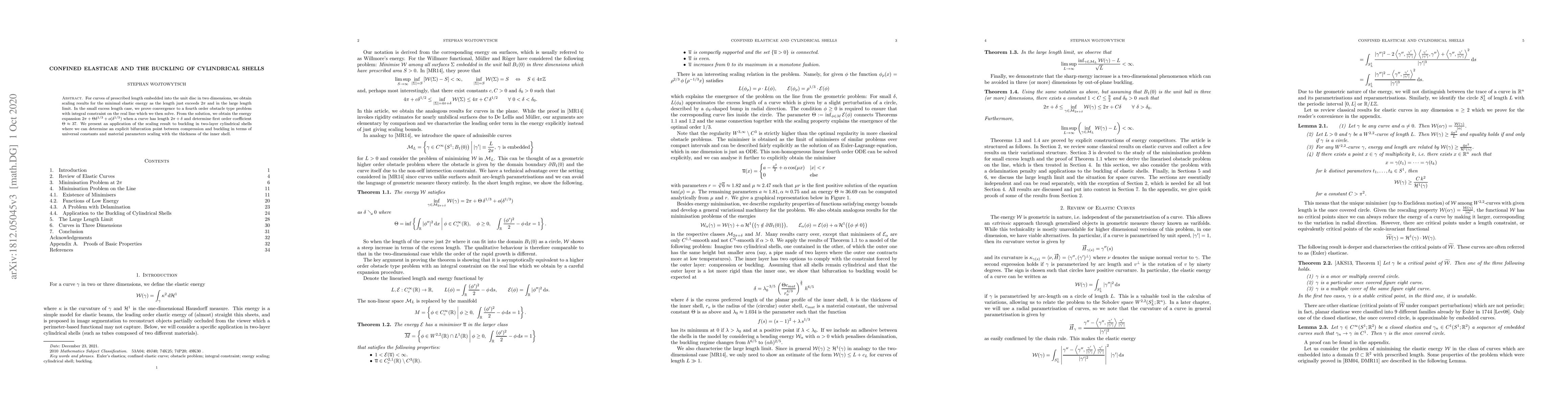 This paper studies the minimal elastic energy of curves embedded in a unit disc, deriving a scaling result for lengths just exceeding $2\pi$ and solving a fourth-order obstacle problem. It applies these results to determine the bifurcation point for buckling in two-layer cylindrical shells, finding $\Theta \approx 37$ in the energy expansion.