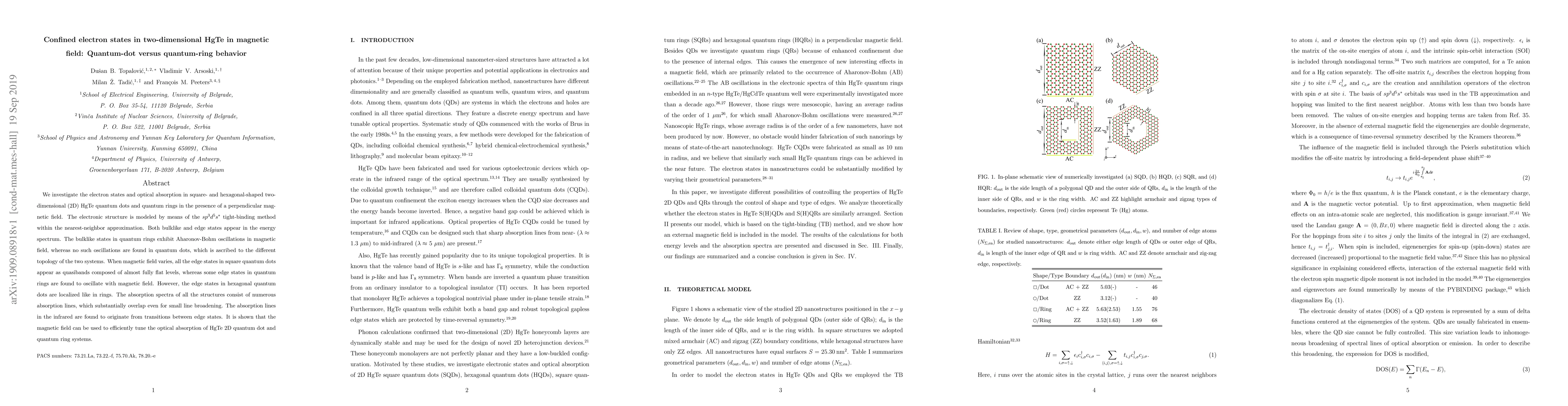 We investigate the electron states and optical absorption in square- and hexagonal-shaped two-dimensional (2D) HgTe quantum dots and quantum rings in the presence of a perpendicular magnetic field. The electronic structure is modeled by means of the $sp^3d^5s^*$ tight-binding method within the nearest-neighbor approximation. Both bulklike and edge states appear in the energy spectrum. The bulklike states in quantum rings exhibit Aharonov-Bohm oscillations in magnetic field, whereas no such oscillations are found in quantum dots, which is ascribed to the different topology of the two systems. When magnetic field varies, all the edge states in square quantum dots appear as quasibands composed of almost fully flat levels, whereas some edge states in quantum rings are found to oscillate with magnetic field. However, the edge states in hexagonal quantum dots are localized like in rings. The absorption spectra of all the structures consist of numerous absorption lines, which substantially overlap even for small line broadening. The absorption lines in the infrared are found to originate from transitions between edge states. It is shown that the magnetic field can be used to efficiently tune the optical absorption of HgTe 2D quantum dot and quantum ring systems.