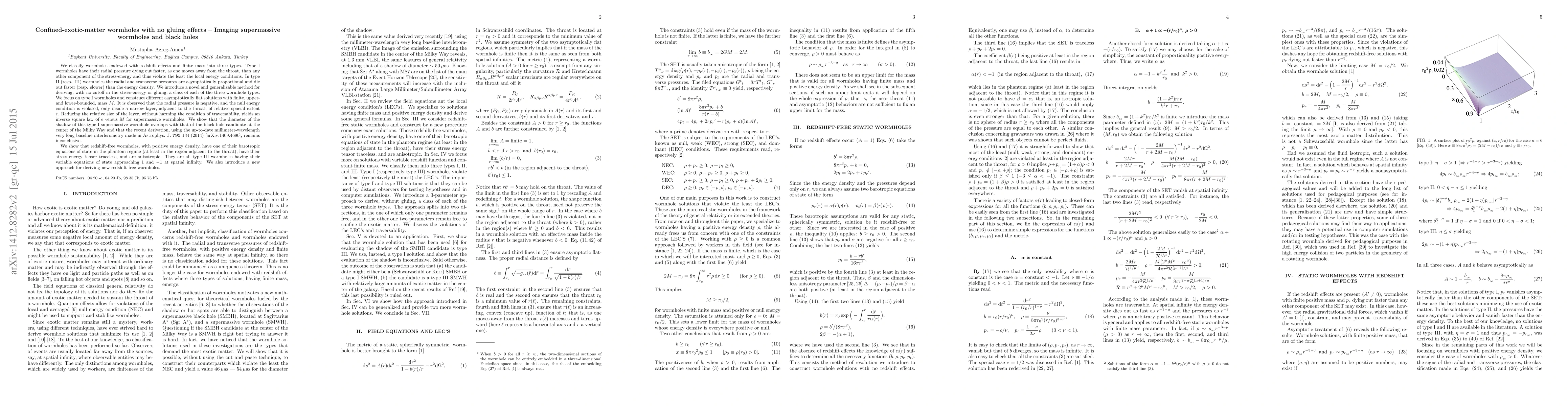 We classify wormholes endowed with redshift effects and finite mass into three types. Type I wormholes have their radial pressure dying out faster, as one moves away from the throat, than any other component of the stress-energy and thus violate the least the local energy conditions. In type II (resp. III) wormholes the radial and transverse pressures are asymptotically proportional and die out faster (resp. slower) than the energy density. We introduce a novel and generalizable method for deriving, with no cutoff in the stress-energy or gluing, a class of each of the three wormhole types. We focus on type I wormholes and construct different asymptotically flat solutions with finite, upper- and lower-bounded, mass $M$. It is observed that the radial pressure is negative, and the null energy condition is violated, only inside a narrow layer, adjacent to the throat, of relative spacial extent $\epsilon$. Reducing the relative size of the layer, without harming the condition of traversability, yields an inverse square law of $\epsilon$ versus $M$ for supermassive wormholes. We show that the diameter of the shadow of this type I supermassive wormhole overlaps with that of the black hole candidate at the center of the Milky Way and that the recent derivation, using the up-to-date millimeter-wavelength very long baseline interferometry made in Astrophys. J. \textbf{795} 134 (2014) [arXiv:1409.4690], remains inconclusive. We show that redshift-free wormholes, with positive energy density, have one of their barotropic equations of state in the phantom regime (at least in the region adjacent to the throat), have their stress energy tensor traceless, and are anisotropic. They are all type III wormholes having their variable equations of state approaching 1 and $-1$ at spatial infinity. We also introduce a new approach for deriving new redshift-free wormholes.