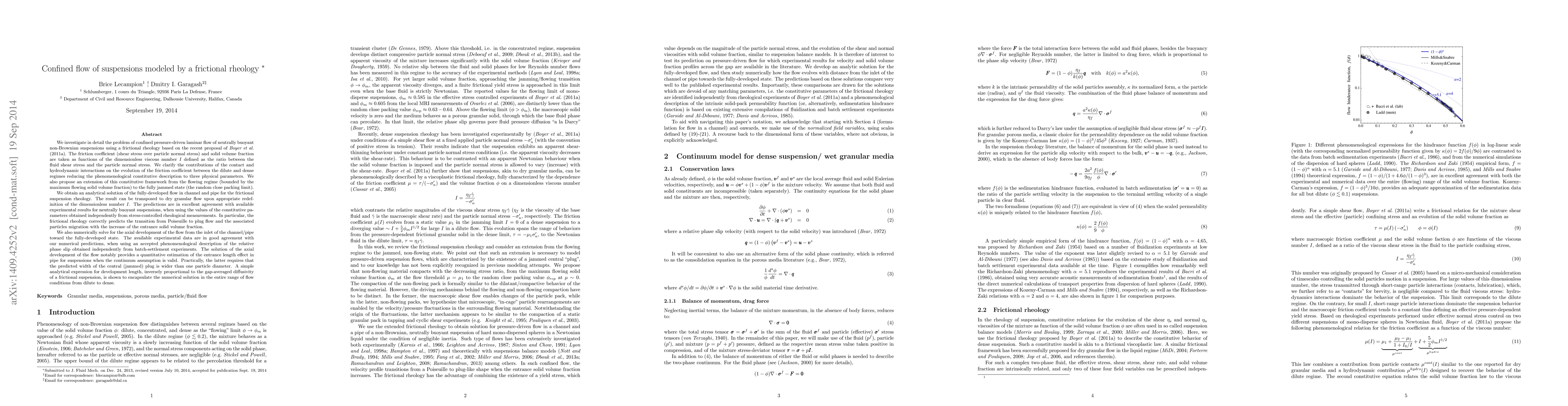 This paper models confined flow of non-Brownian suspensions using a frictional rheology, deriving an analytical solution for fully-developed flow in channels and pipes. The model accurately predicts the transition from Poiseuille to plug flow and particle migration, matching experimental data.