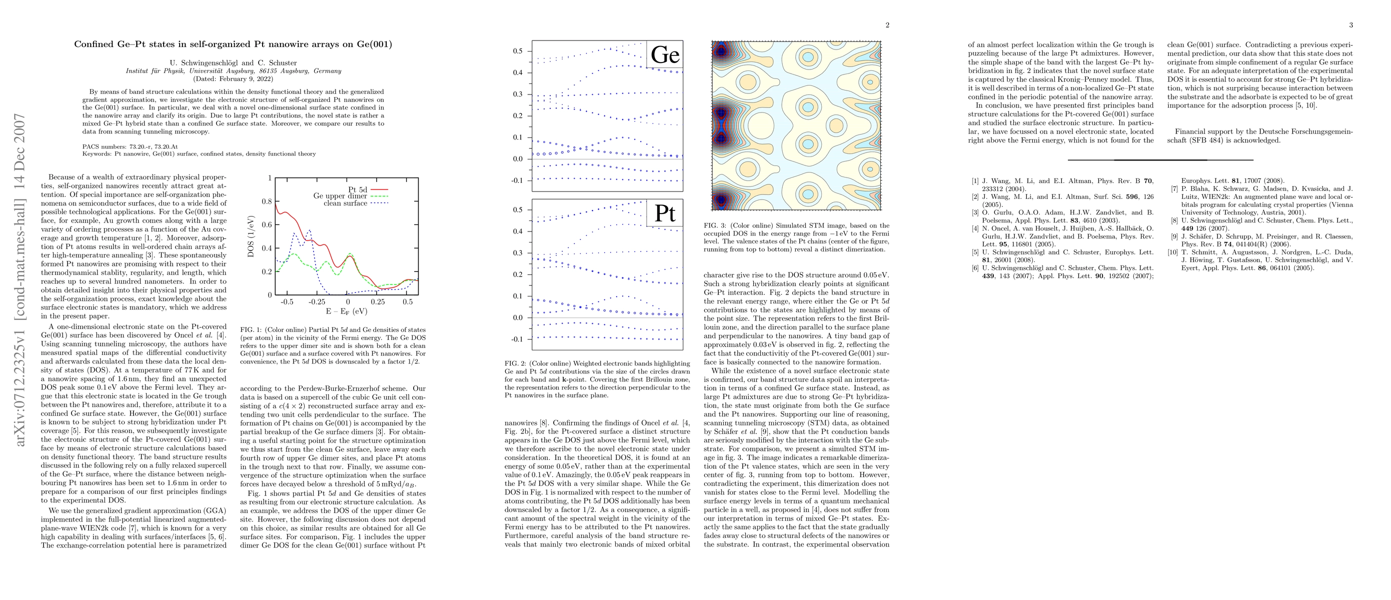 This study uses density functional theory to explore the electronic structure of self-organized Pt nanowires on Ge(001), revealing a novel one-dimensional surface state that is a mixed Ge-Pt hybrid rather than a confined Ge state, supported by scanning tunneling microscopy data.